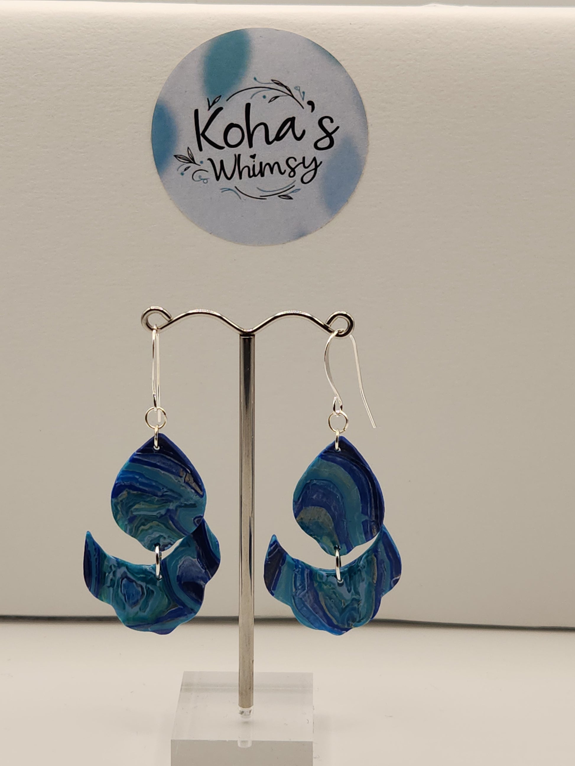 These handmade polymer clay earrings feature a cascading petal design inspired by the natural beauty of blue agate. Lightweight yet durable, they offer an elegant statement piece that complements both casual and formal styles. Expertly crafted to capture the soothing hues and organic flow of blue agate, these dangle earrings provide a unique accessory that enhances your look with subtle sophistication.
