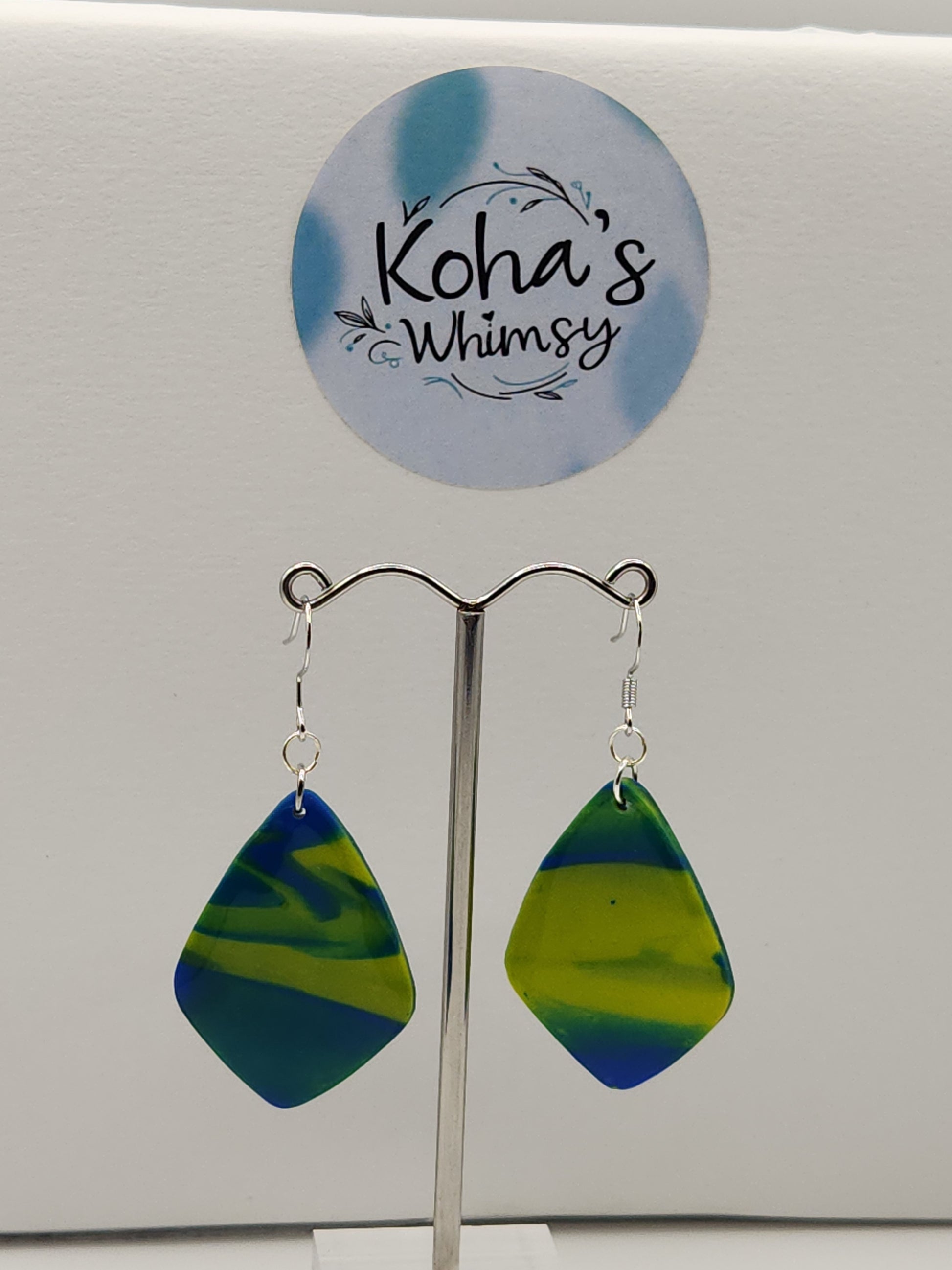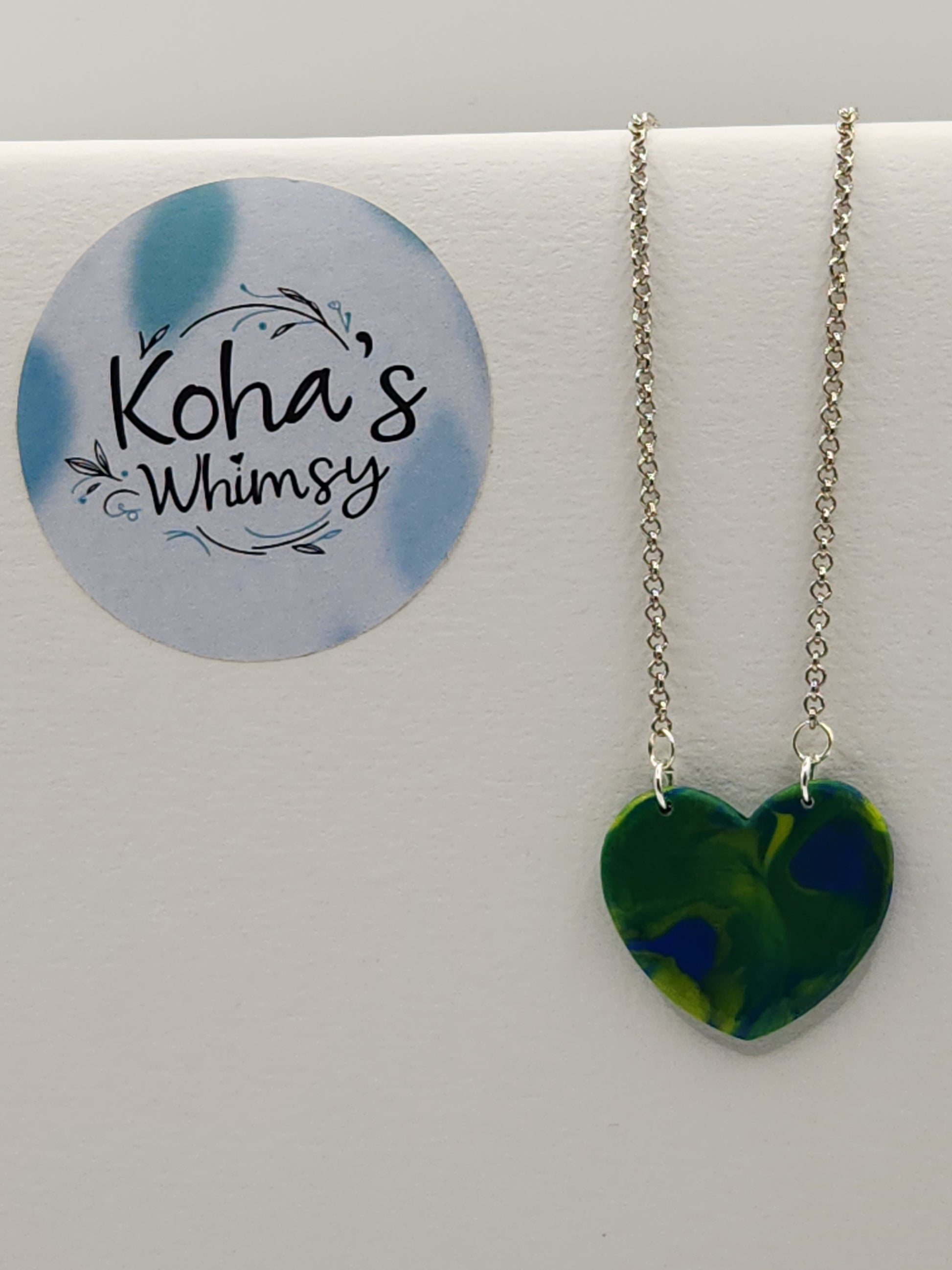 This handmade polymer clay jewellery set features large drop diamond-shaped dangle earrings and a matching heart pendant. The yellow and blue hues blend seamlessly, creating delicate wisps of green that add depth and uniqueness to each piece. Expertly crafted, this set offers a sophisticated yet playful accessory perfect for elevating any outfit with a touch of artisanal charm.