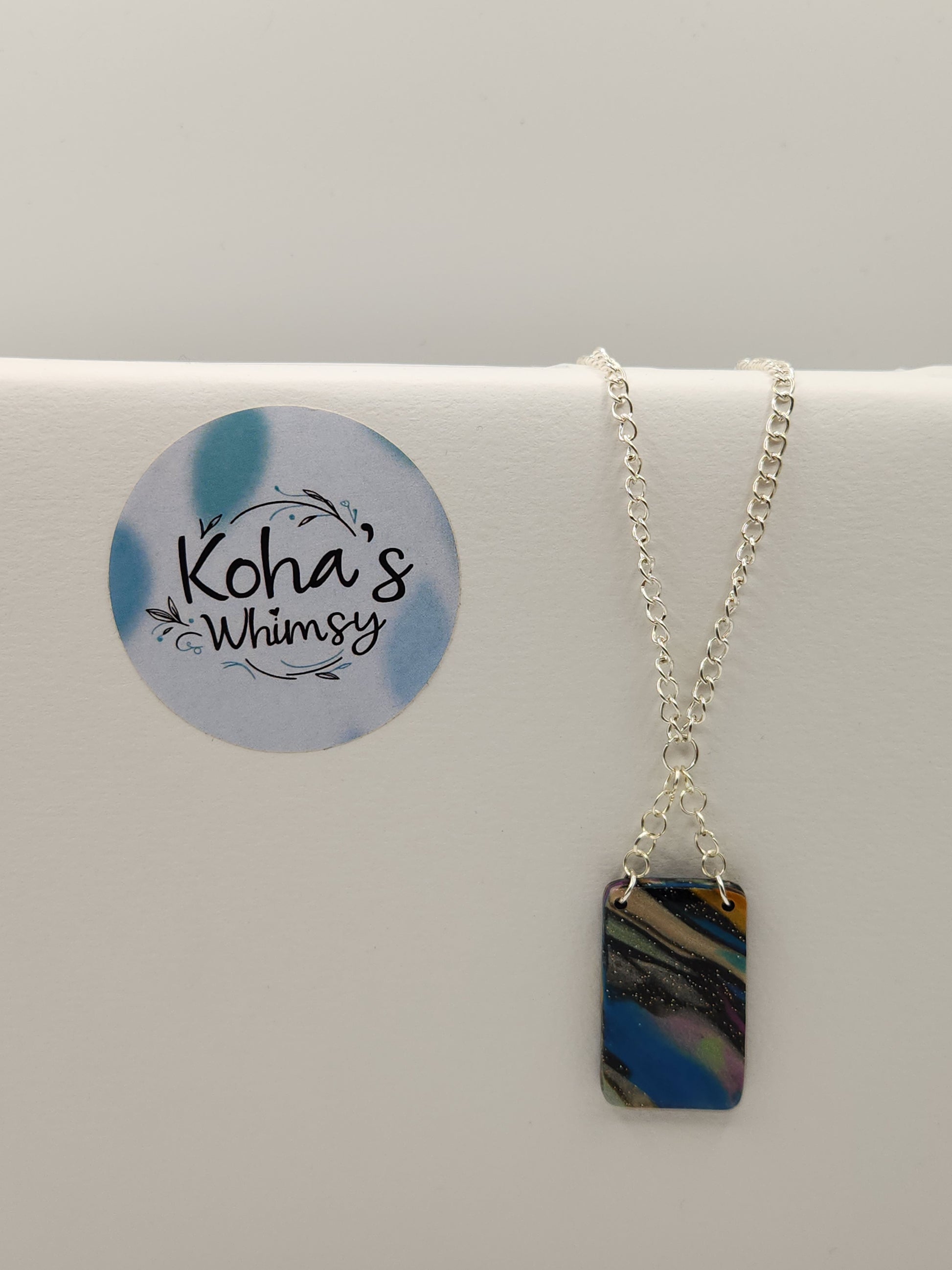 These handmade polymer clay earrings feature a unique marbled pattern created by expertly blending blue, gold, black, green-silver, and magenta scraps. The small quadrangle dangle earrings, and the large rectangle pendant necklace design offers a sophisticated yet distinctive accessory, perfect for adding an artistic touch to any outfit. Each pair is one-of-a-kind, showcasing the intricate craftsmanship and attention to detail in every piece.