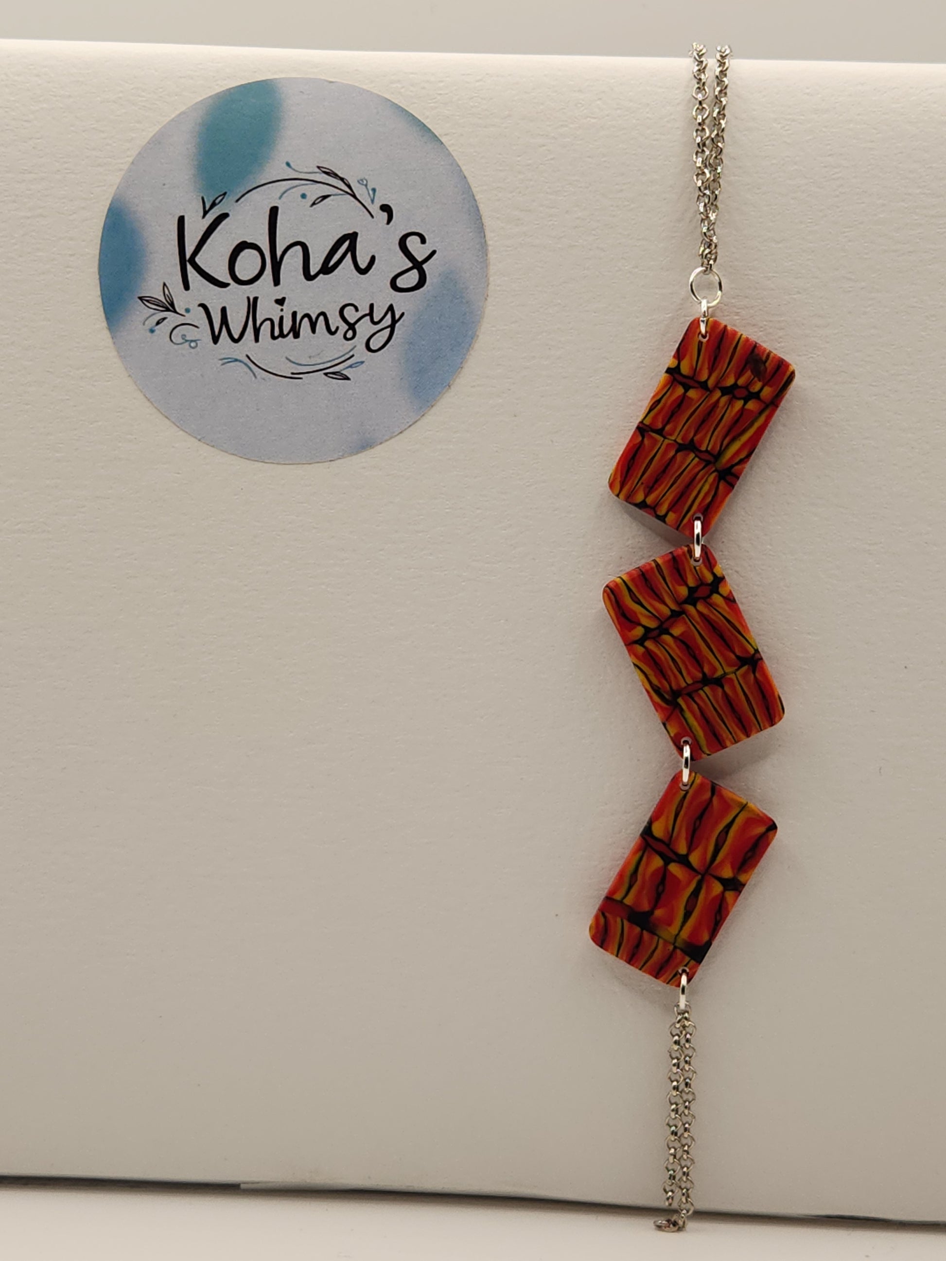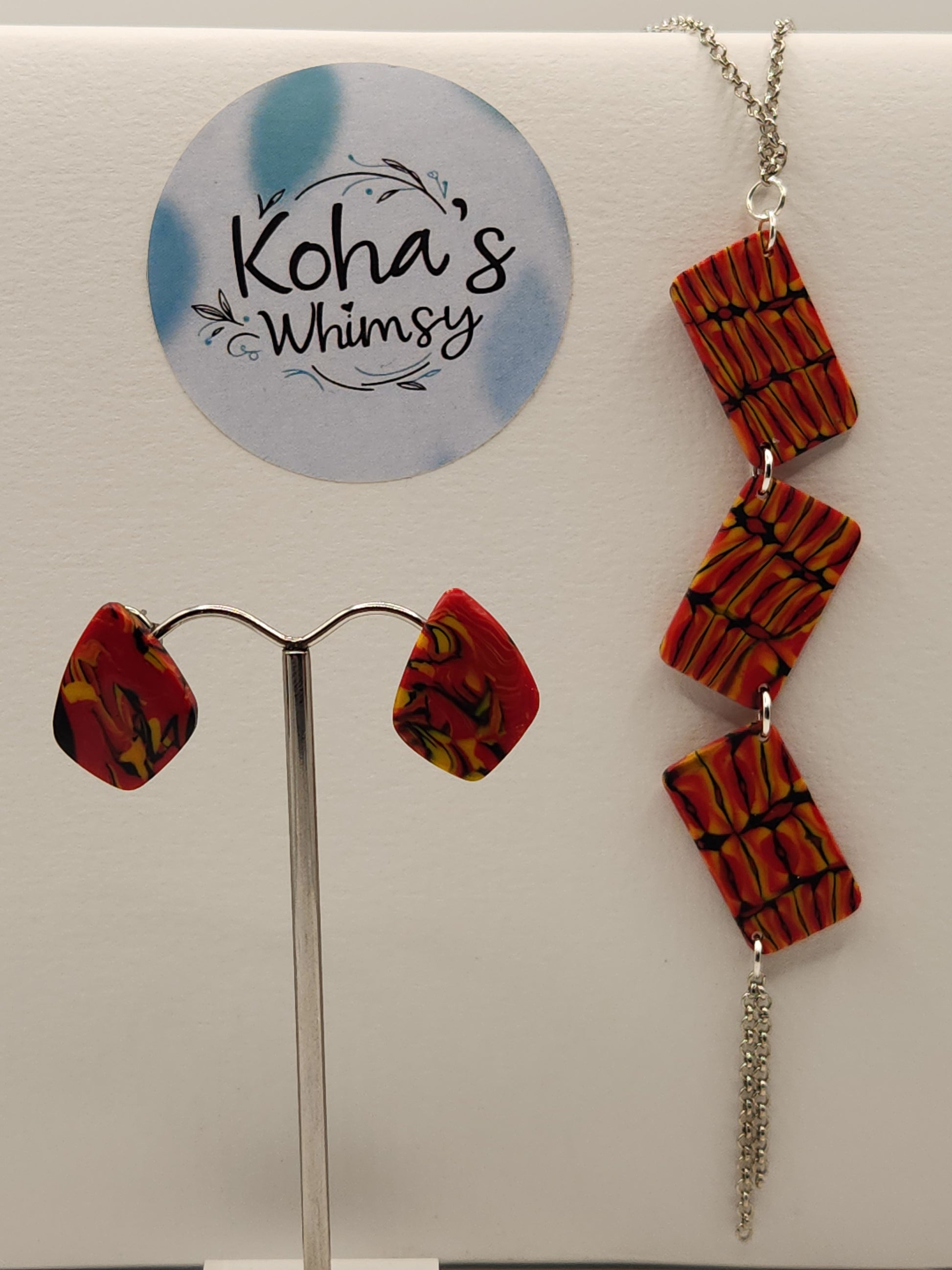 This Dreamtime Jewellery Set is expertly handcrafted from polymer clay, featuring a striking palette of red, black, and yellow. Their design draws inspiration from traditional Indigenous Australian art, evoking cultural depth and storytelling through vibrant colours and geometric shapes. Lightweight and durable, the small drop diamond stud earrings, and the necklace of cascading rectangles offer a unique way to celebrate and honour Indigenous heritage with contemporary style.