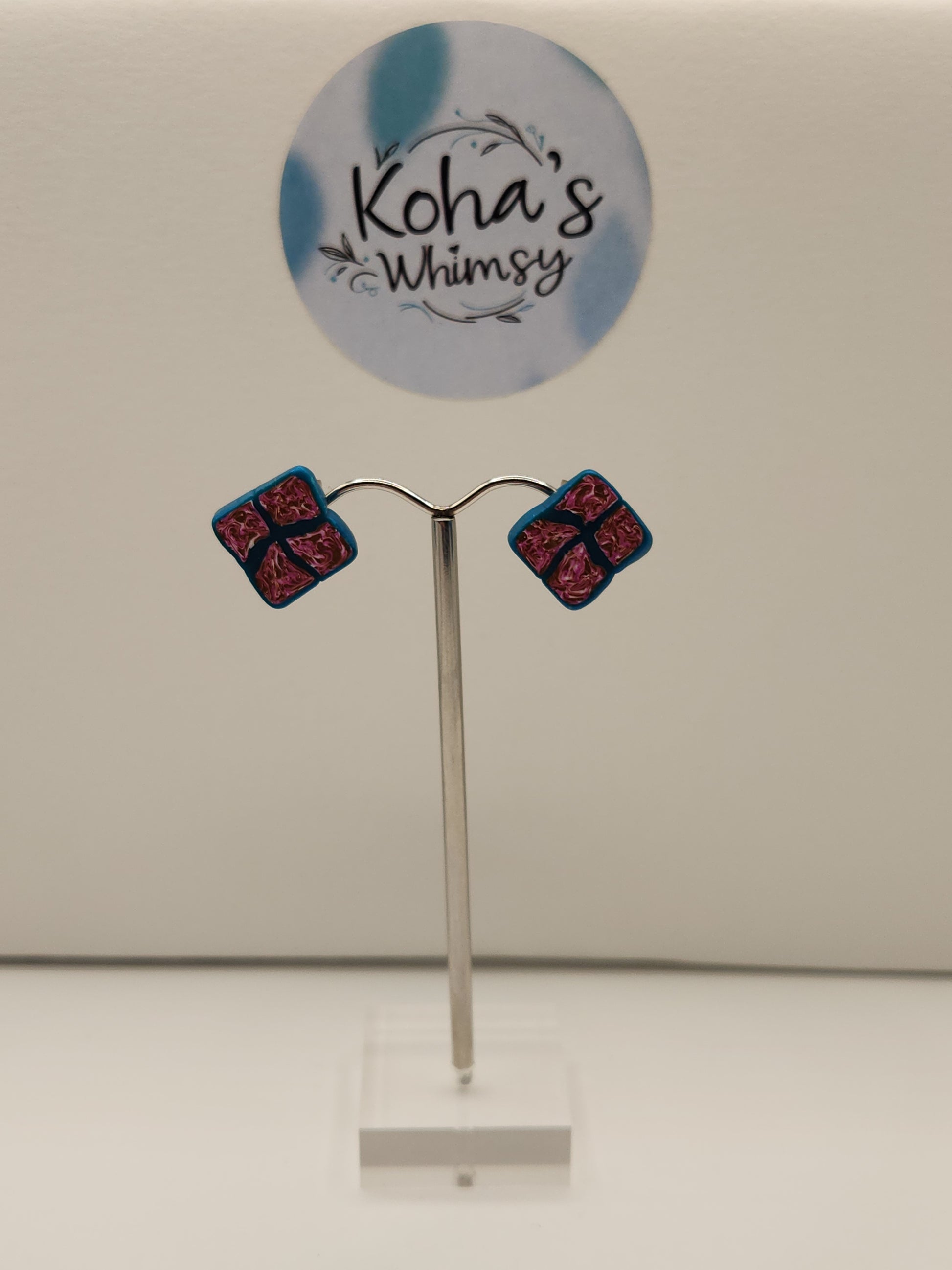 These handmade polymer clay studs feature a distinctive small diamond shape outlined in dark teal, highlighting a sophisticated blend of fuchsia, gold, and white sections. Expertly crafted, they offer a unique accessory that combines vibrant colours with elegant design, perfect for adding a refined touch to any outfit.