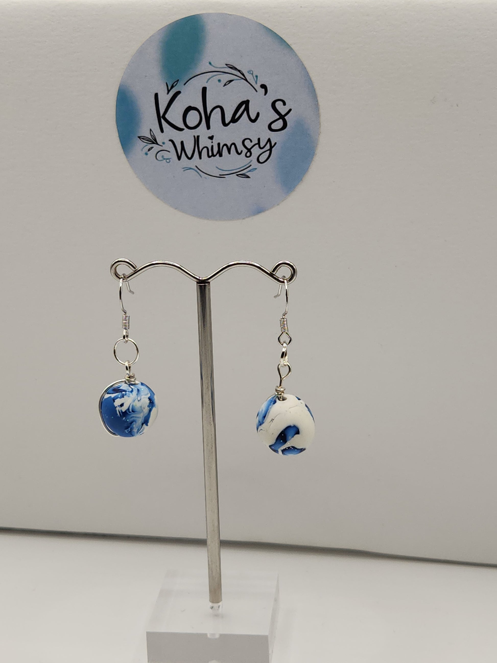 The Galactic Dreams Jewellery Set showcases expertly handmade polymer clay pieces, including wire-wrapped bead dangle earrings and an elongated teardrop pendant necklace. Each item features a seamless blend of blues, transitioning from light to dark with a subtle shimmer, set against a clean white background. This set combines artisanal craftsmanship with elegant design, offering a sophisticated accessory choice that complements both casual and formal styles.