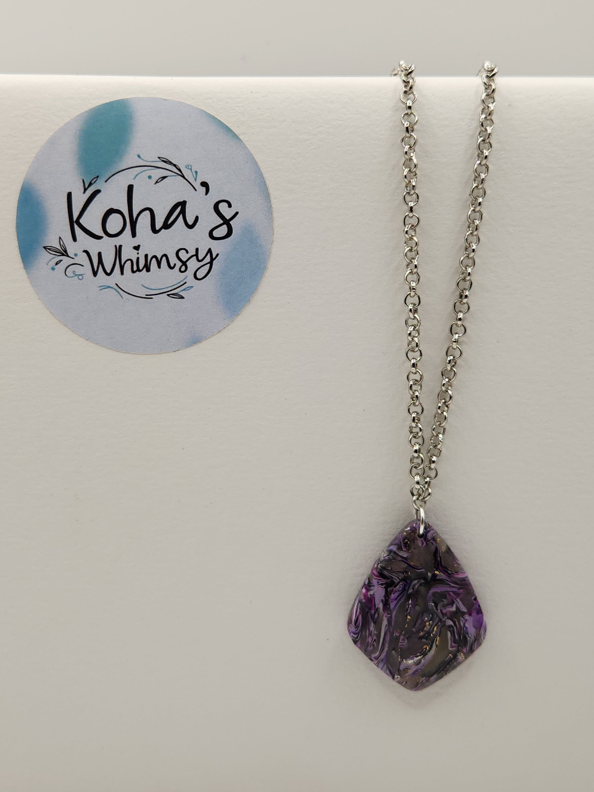 Elevate your style with the Indigo Shimmer Jewellery Set, featuring expertly handcrafted polymer clay pieces. This set includes delicate small drop diamond dangle earrings and a striking large drop diamond pendant necklace. Each piece showcases a sophisticated blend of purple, pink, black, and white hues, enhanced with subtle gold foil accents for a refined shimmer. Perfect for those who appreciate artisanal craftsmanship and unique, elegant accessories.