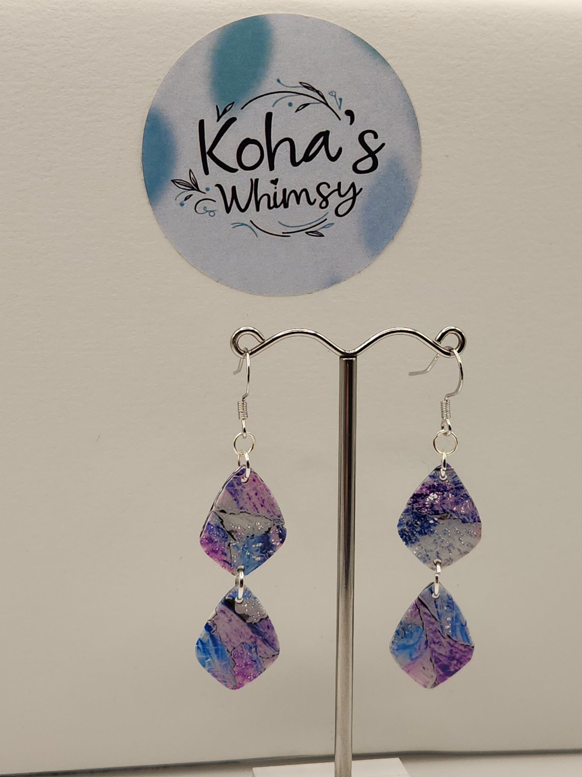 These handmade polymer clay dangle earrings feature a unique metallic watercolour design, blending blues, pinks, purples, whites, reds, and blacks with delicate silver foil accents. Their various shapes offers a modern, artistic touch, perfect for adding subtle sophistication to any outfit. Crafted with expert attention to detail, these earrings combine vibrant colours and shimmering textures for a distinctive, wearable piece of art.