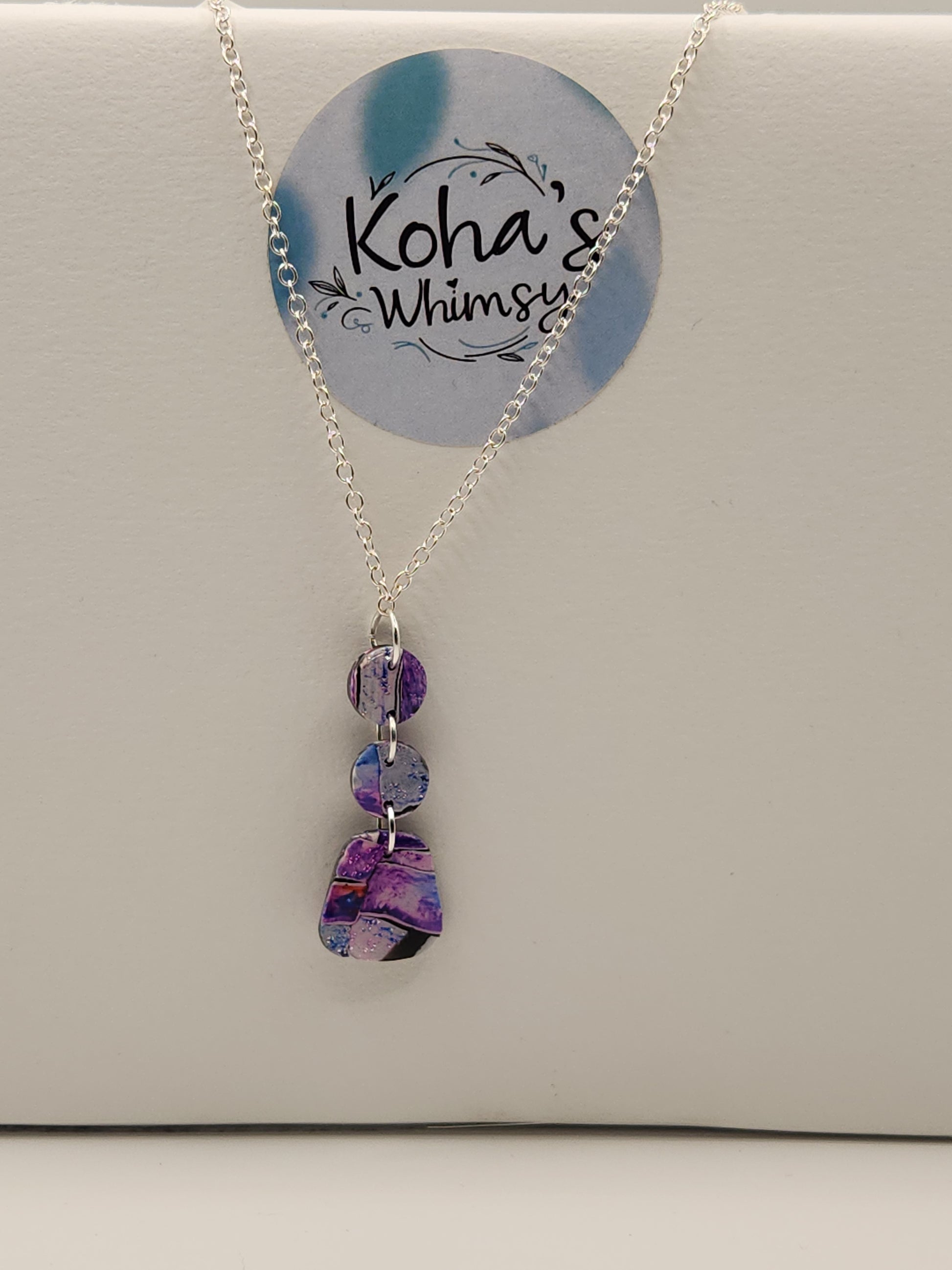 This handmade polymer clay jewellery set features a unique metallic watercolour design, blending blues, pinks, purples, whites, reds, and blacks with delicate silver foil accents. The large drop diamond dangle earrings and paired circle and small quadrangle dangle pendant necklace offers a modern, artistic touch, perfect for adding subtle sophistication to any outfit. Crafted with expert attention to detail, these earrings combine vibrant colours and shimmering textures for a distinctive, wearable piece of art.