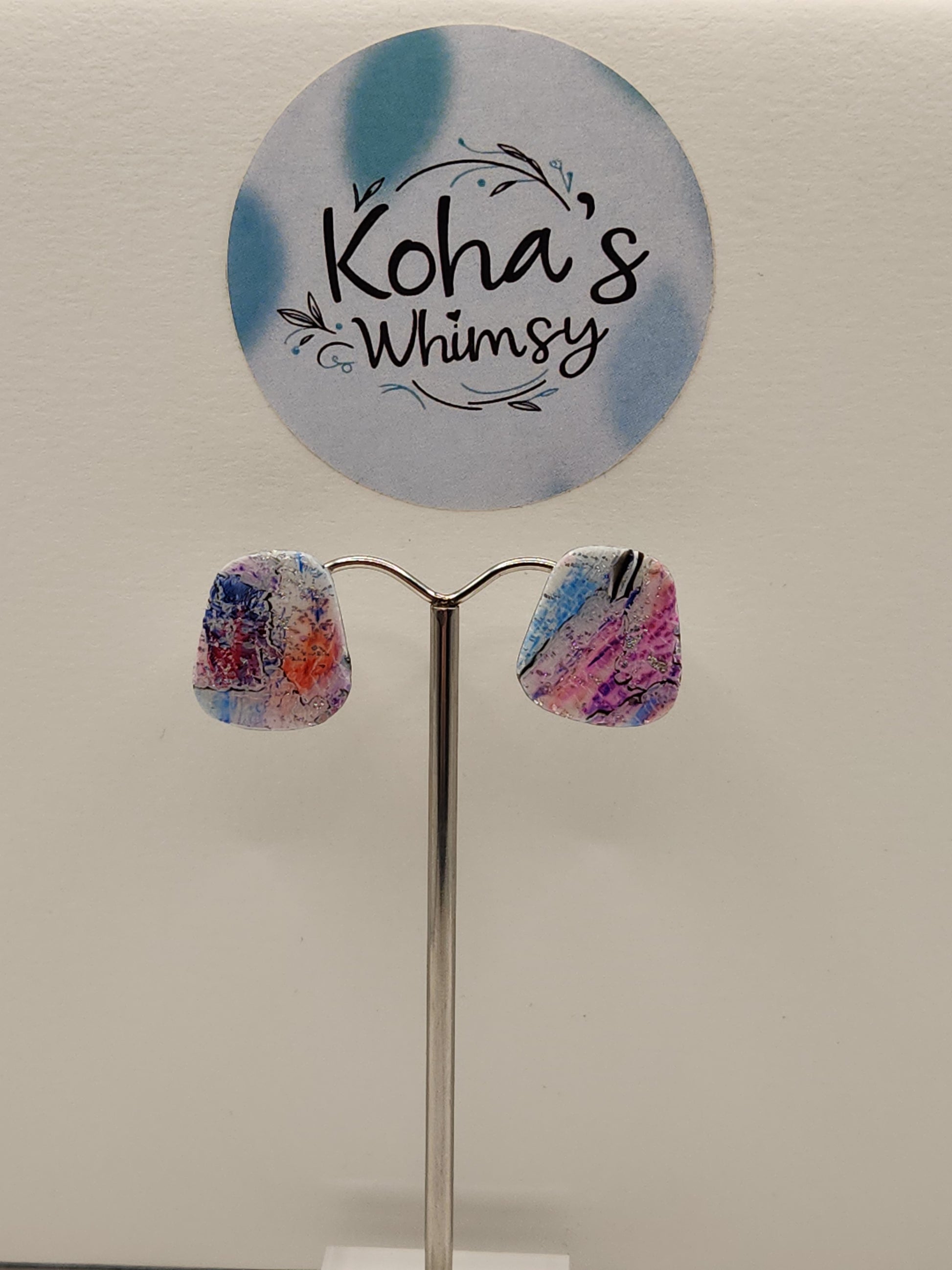 These handmade polymer clay dangle earrings feature a unique metallic watercolour design, blending blues, pinks, purples, whites, reds, and blacks with delicate silver foil accents. Their various shapes offers a modern, artistic touch, perfect for adding subtle sophistication to any outfit. Crafted with expert attention to detail, these earrings combine vibrant colours and shimmering textures for a distinctive, wearable piece of art.