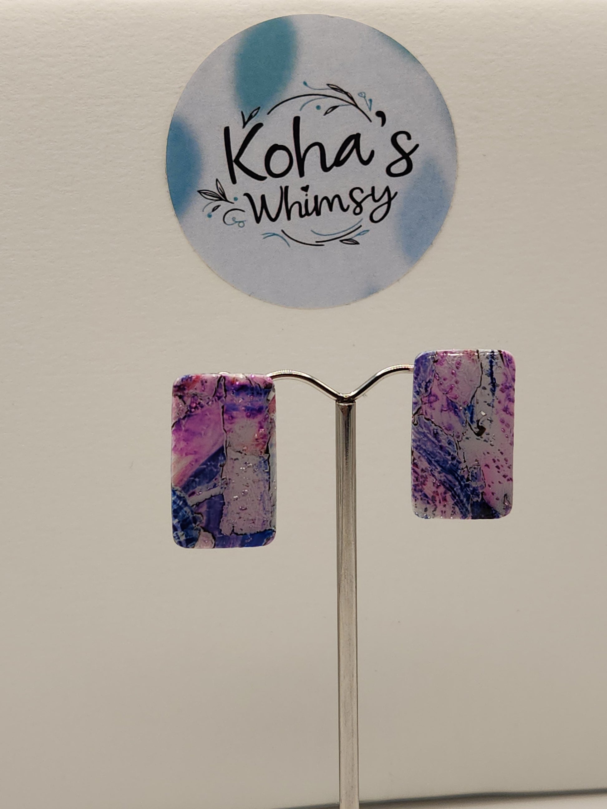 These handmade polymer clay dangle earrings feature a unique metallic watercolour design, blending blues, pinks, purples, whites, reds, and blacks with delicate silver foil accents. Their various shapes offers a modern, artistic touch, perfect for adding subtle sophistication to any outfit. Crafted with expert attention to detail, these earrings combine vibrant colours and shimmering textures for a distinctive, wearable piece of art.