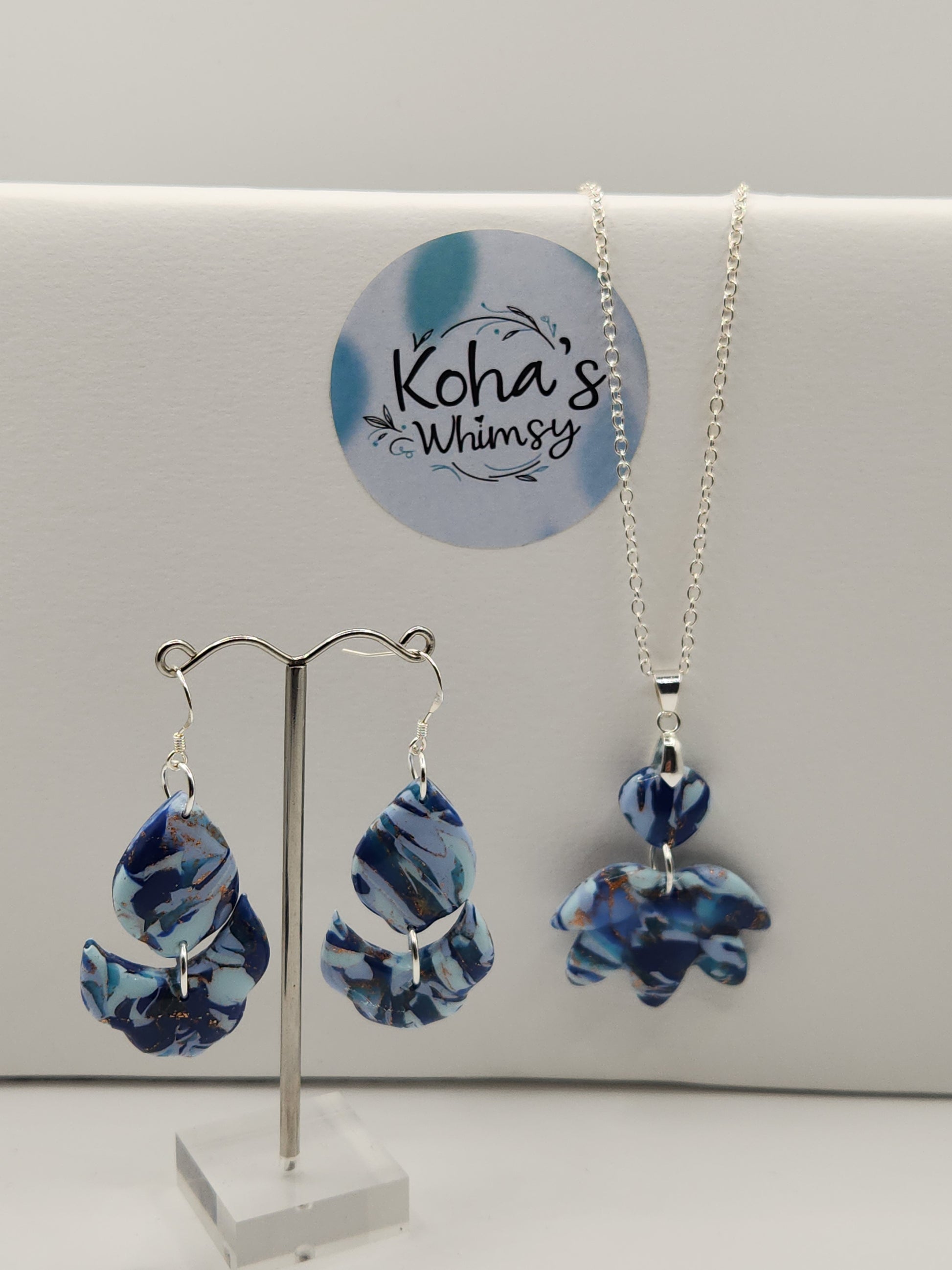 This Ocean Vibes Jewellery Set showcases expertly handmade polymer clay earrings inspired by the deep blues of the ocean. The large cascading petal dangle earrings feature sterling silver hooks for a secure and elegant finish. Complementing the earrings is a bold large lotus bloom pendant necklace, designed to evoke the calm and beauty of ocean waves. Together, these pieces offer a sophisticated, nature-inspired look crafted with attention to detail and quality materials.