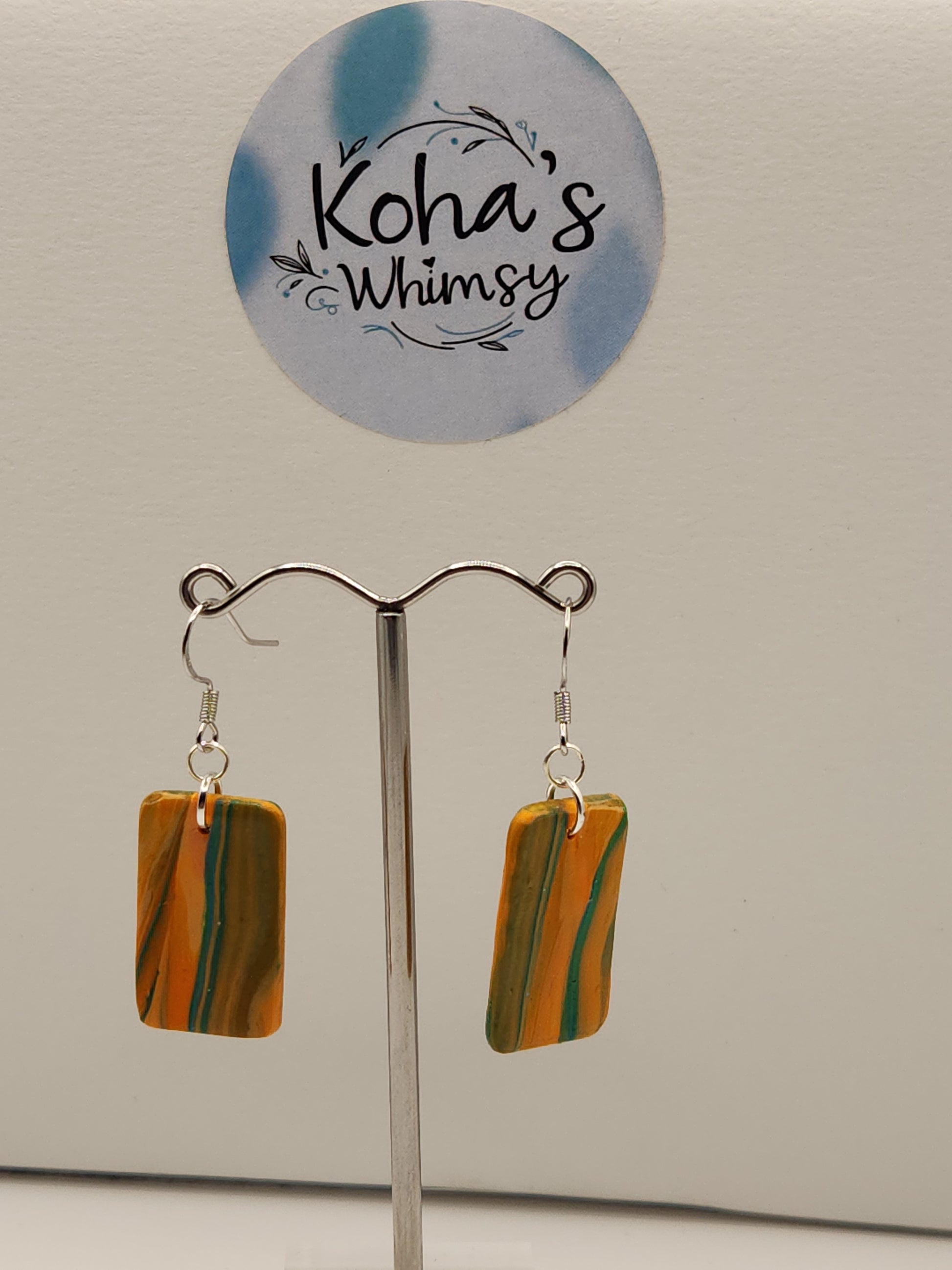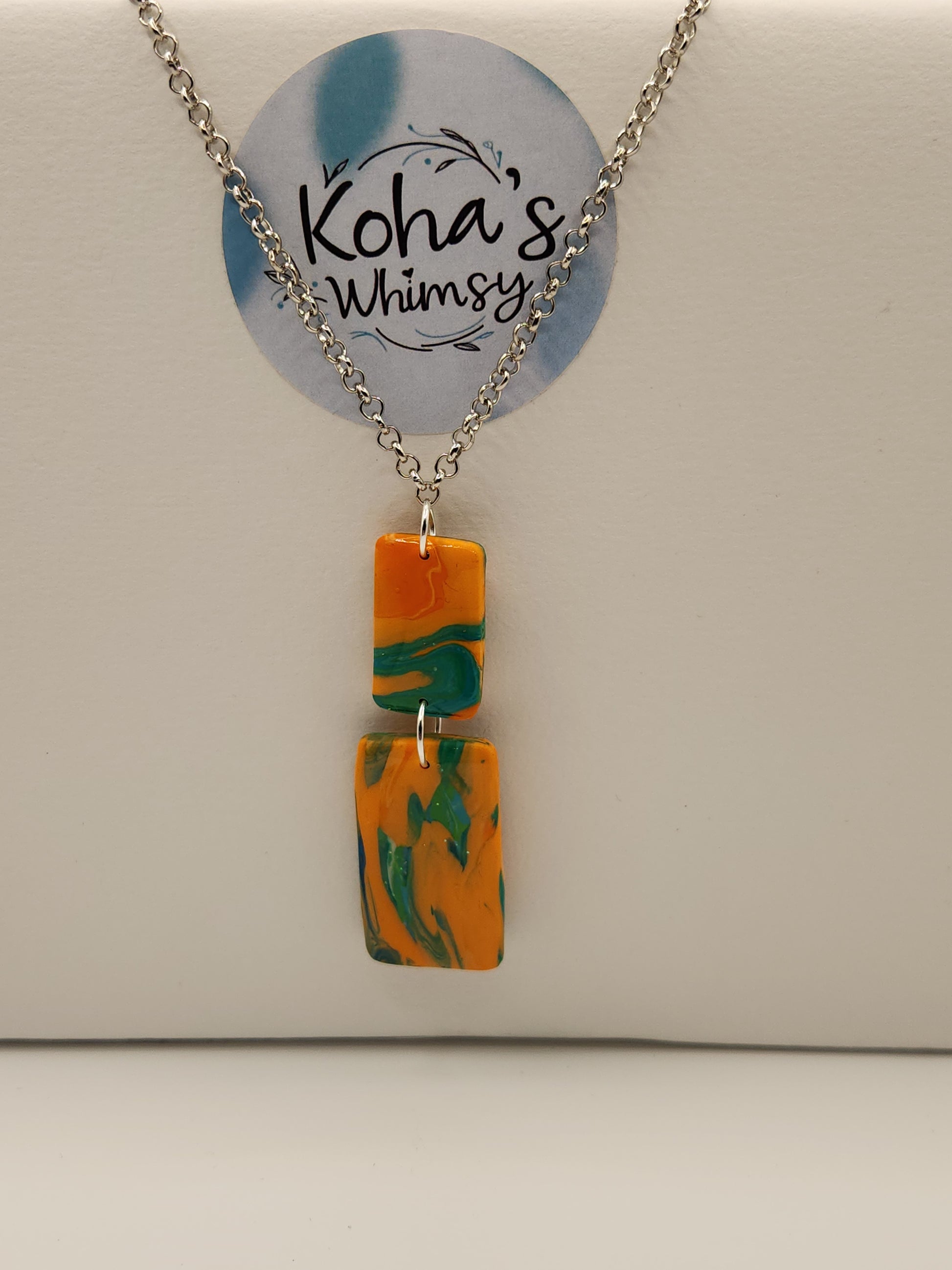 Crafted from handmade polymer clay, the Orange Emerald Jewellery Set features small rectangle dangle earrings and a bold rectangle dangle pendant. This striking set combines vibrant shades of orange, green, and teal, enhanced with subtle glitter accents for a refined shimmer. Perfect for those seeking a statement accessory with expert craftsmanship and a unique blend of colours.