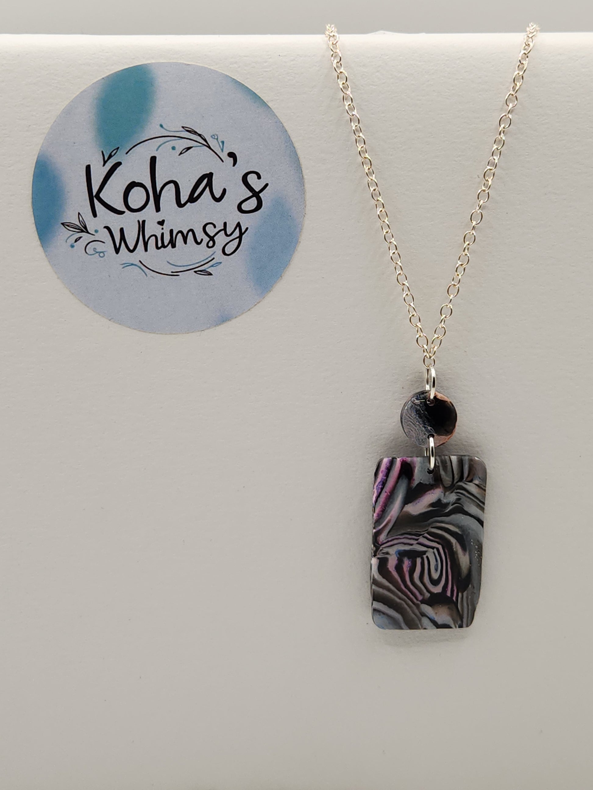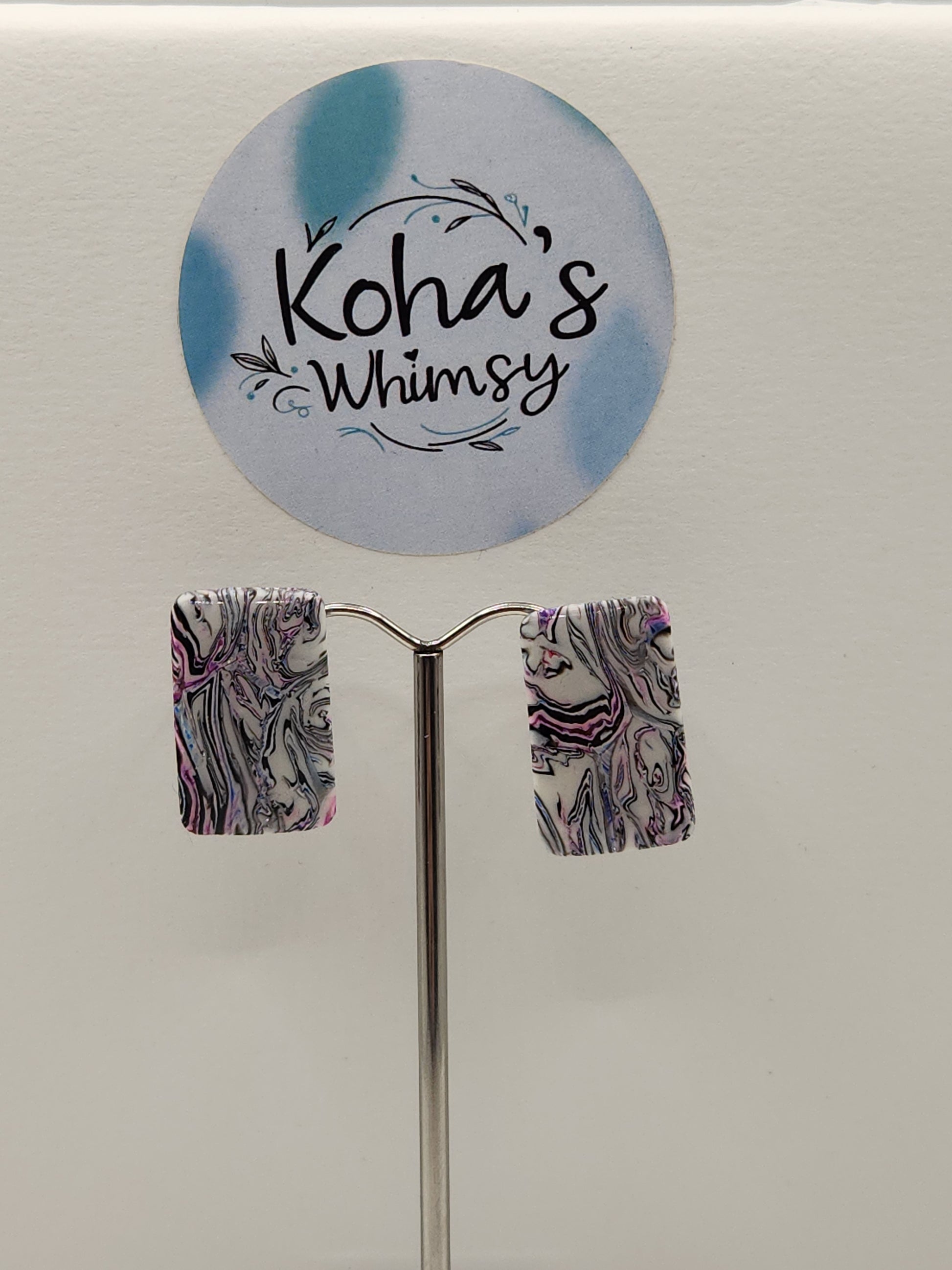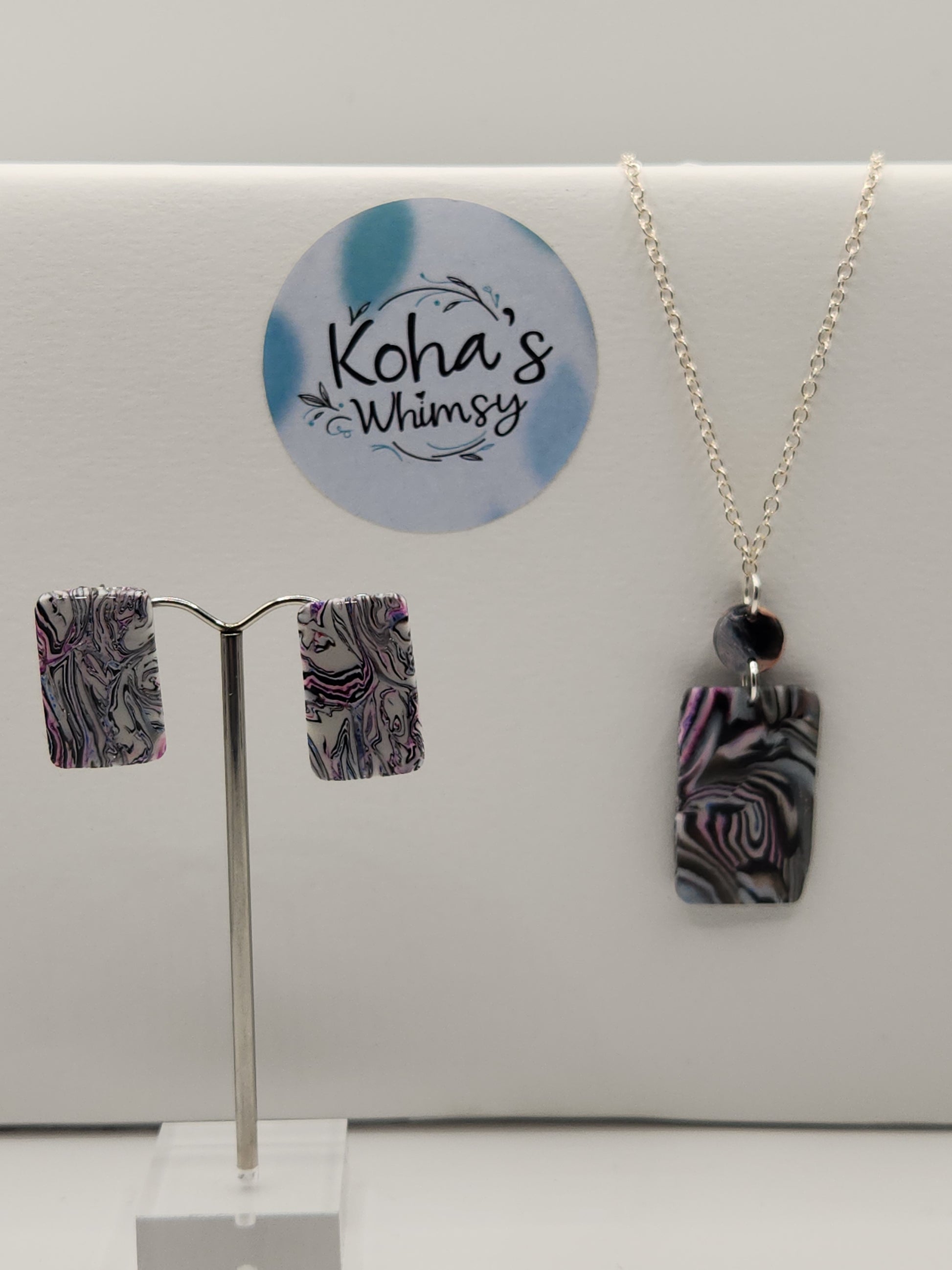 This Pale Chaos small rectangle stud earrings, paired with a large rectangle pendant necklace, showcases expert craftsmanship with a white polymer clay base intricately accented by chaotic black lines and subtle hints of pink. Their unique design offers a modern, artistic statement piece that complements both casual and refined styles, highlighting your attention to detail and appreciation for handmade artistry. Lightweight and comfortable, they provide an elegant yet edgy accessory for everyday wear or special occasions.