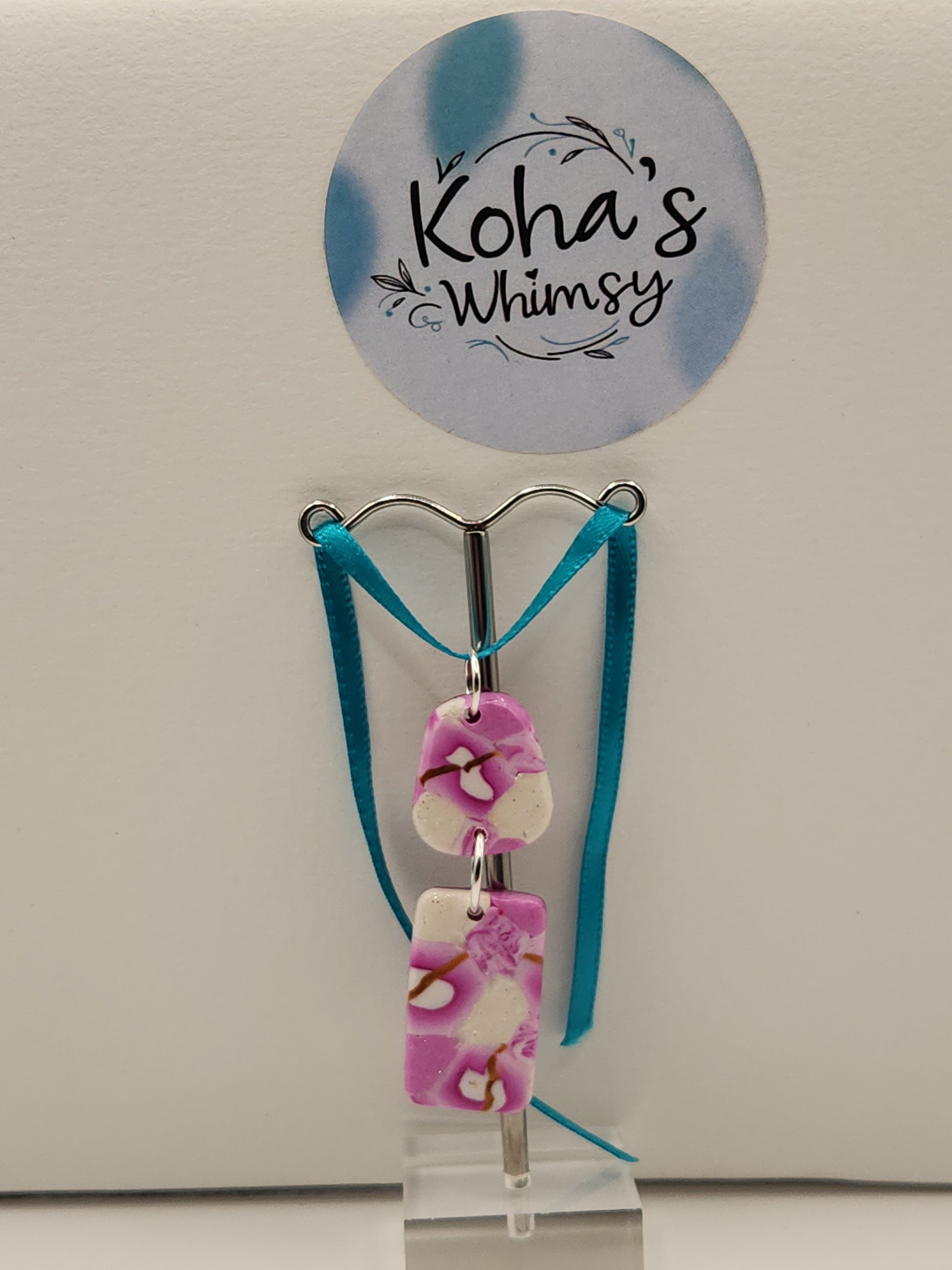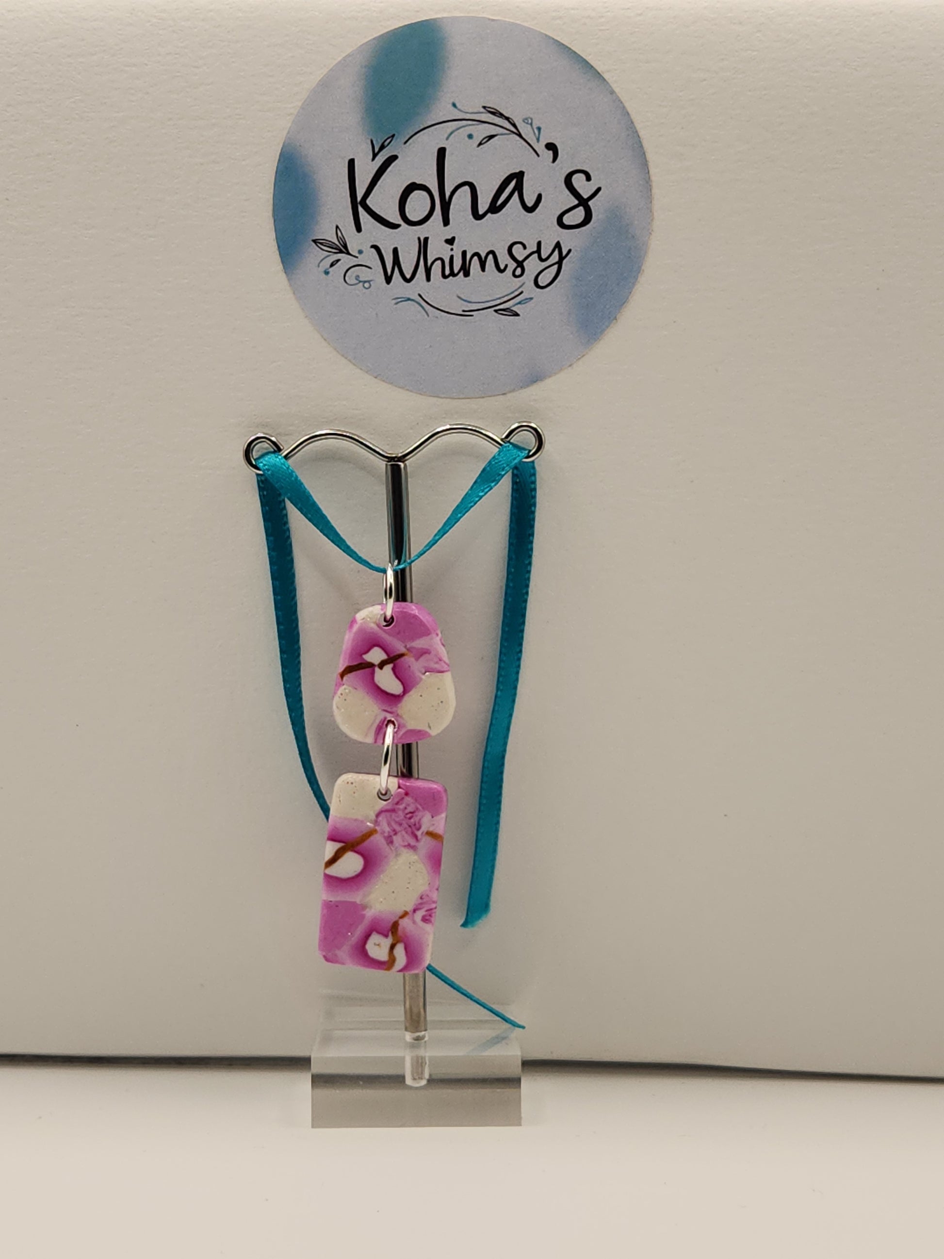 This handmade polymer clay pendant features a delicate combination of small quadrangle and rectangle shapes in soft pink hues, accented with elegant gold streaks and subtle white details. Its refined design offers a unique accessory that complements both casual and formal styles, showcasing expert craftsmanship and attention to detail. Perfect for adding a touch of sophisticated charm to your jewellery collection.