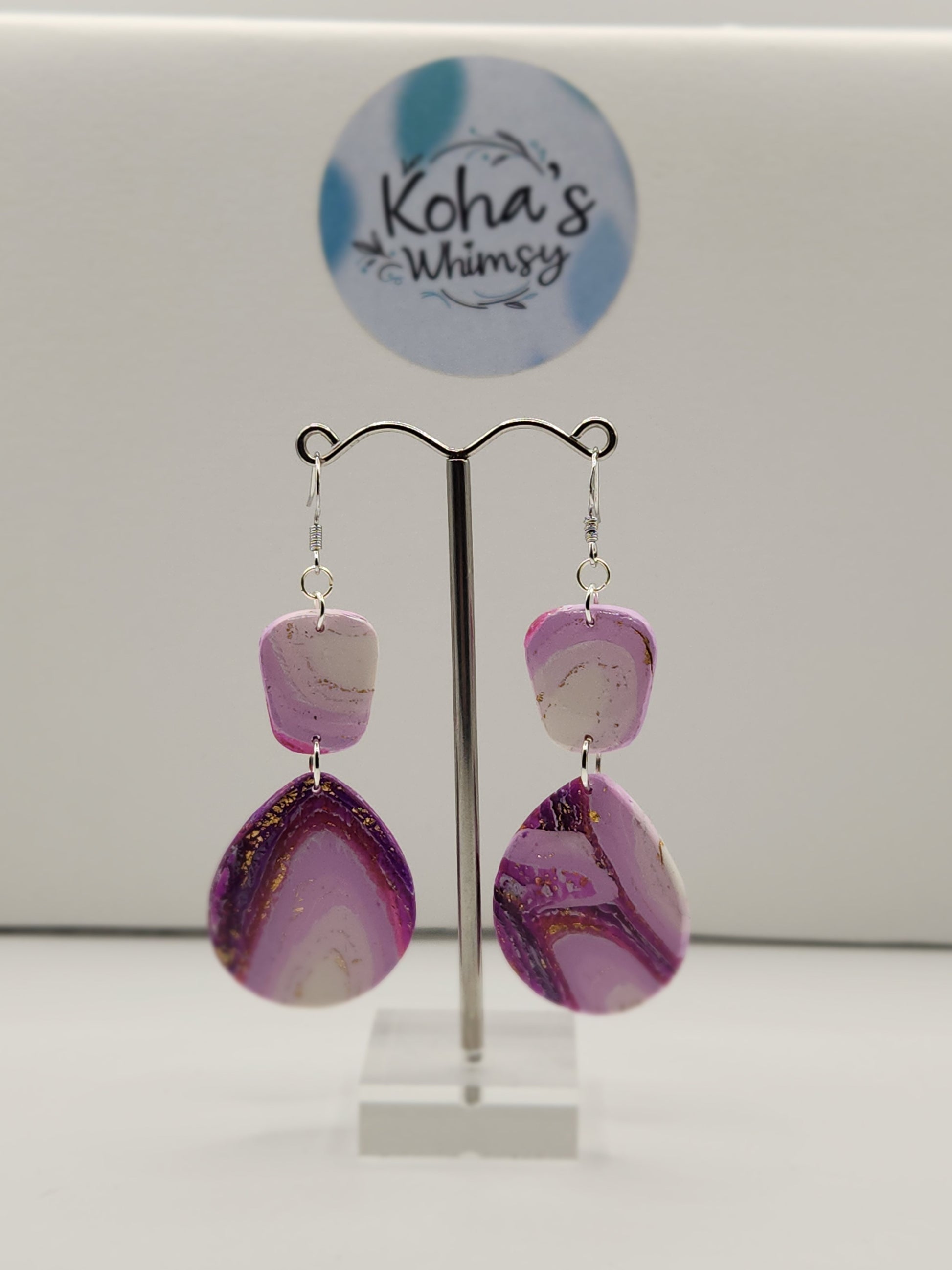 These handmade polymer clay earrings capture the delicate beauty of purple lace agate with their designs. Expertly crafted, they offer a lightweight yet durable accessory that complements both casual and formal styles. Their unique pattern and subtle hues provide a sophisticated touch, making them an elegant addition to any jewellery collection.