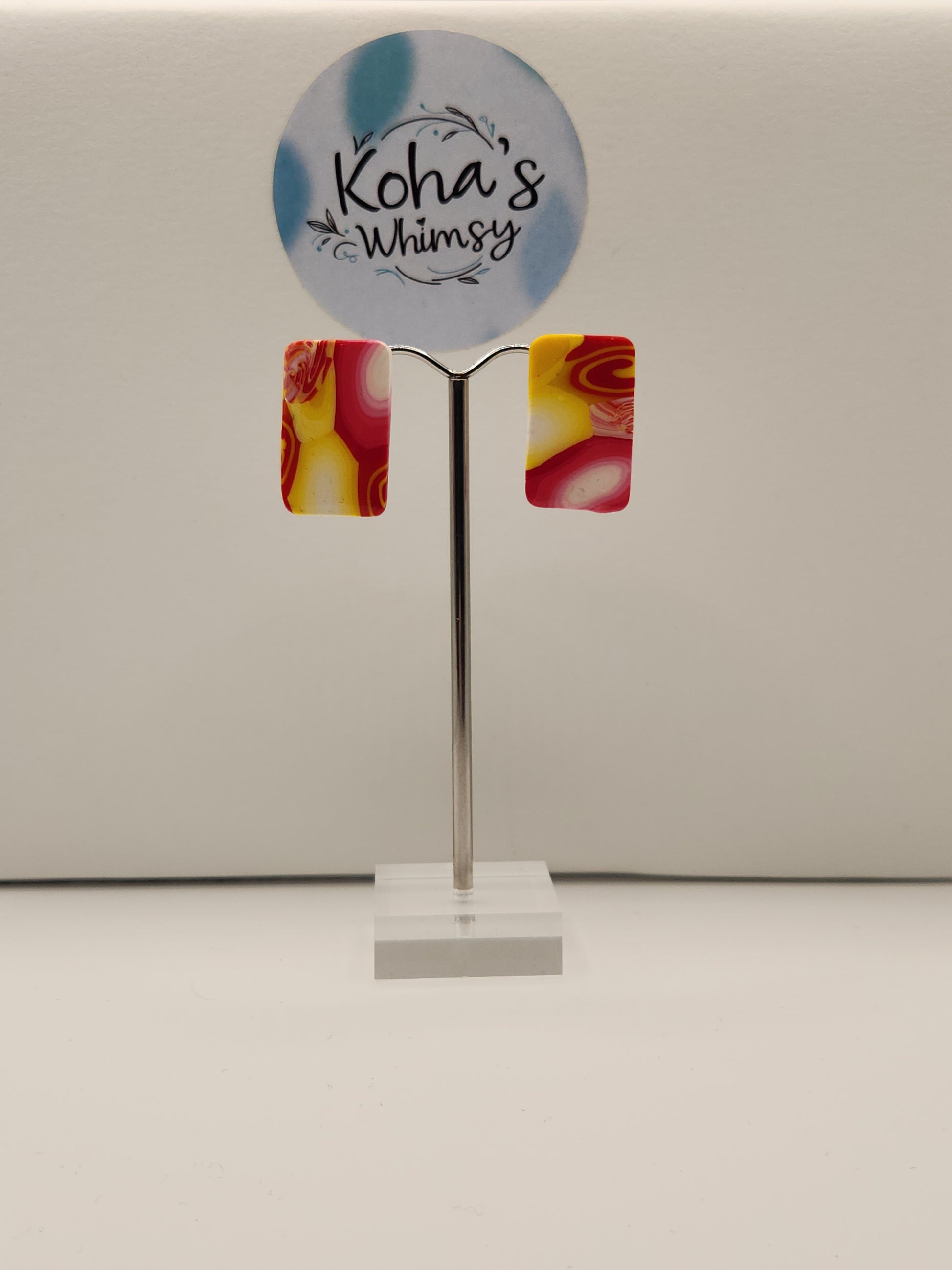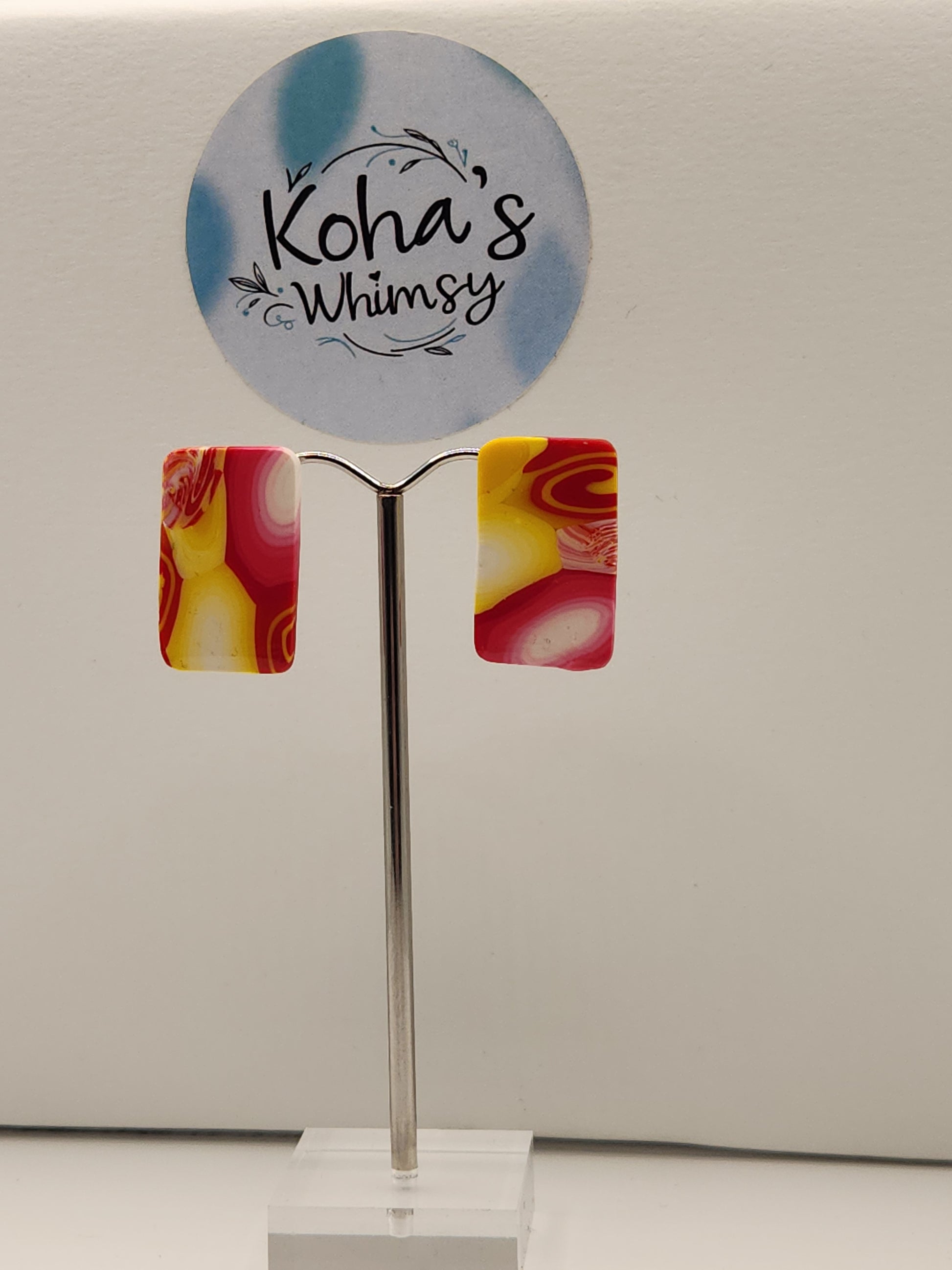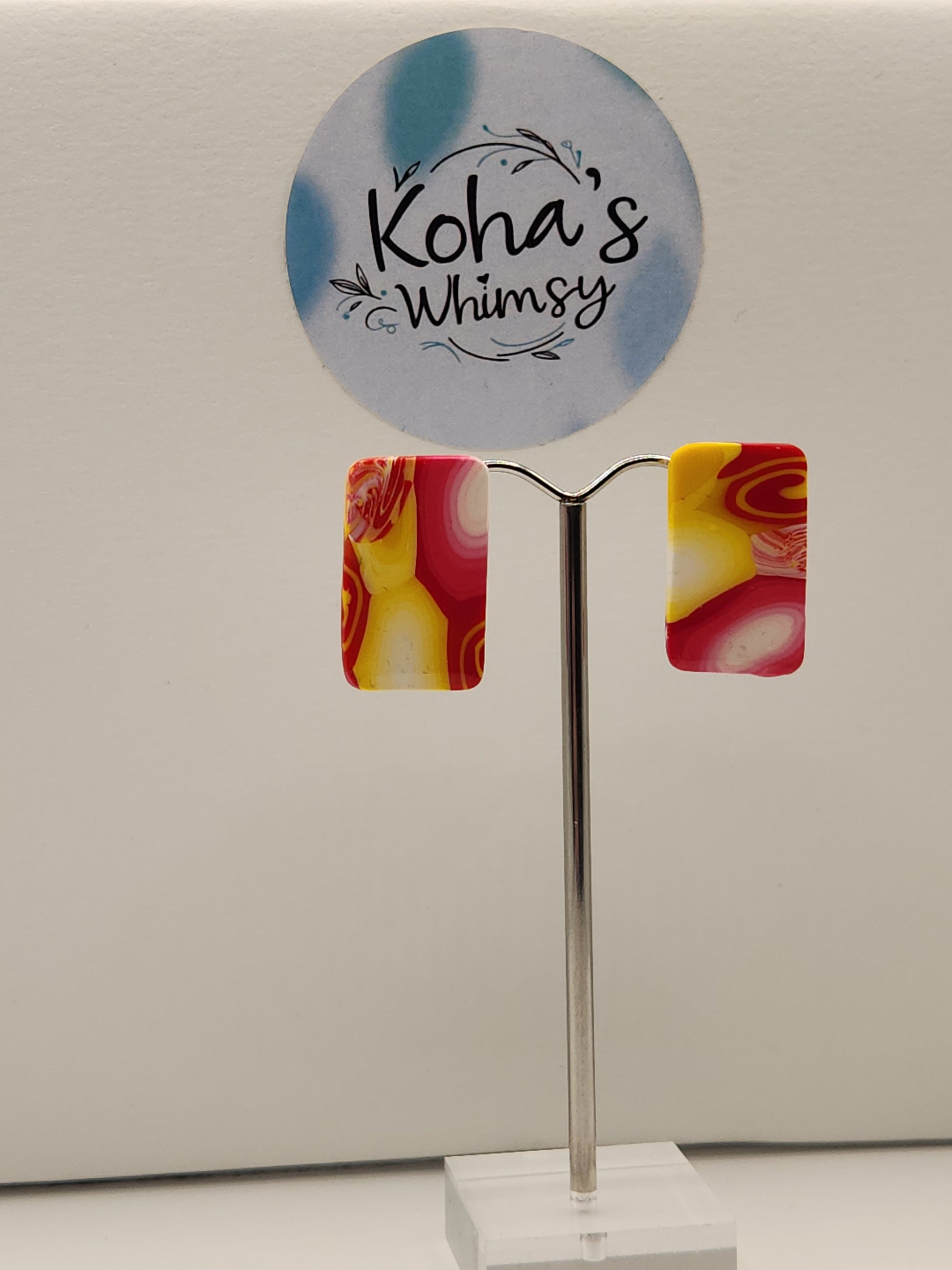 These handmade polymer clay stud earrings feature delicate gradient blends from white to red and white to yellow, capturing the refreshing essence of raspberry lemonade. Their various shapes offers a subtle yet sophisticated accessory, perfect for adding a touch of vibrant colour and artisanal charm to any outfit. Crafted with expert attention to detail, these earrings combine playful hues with refined design for everyday elegance.