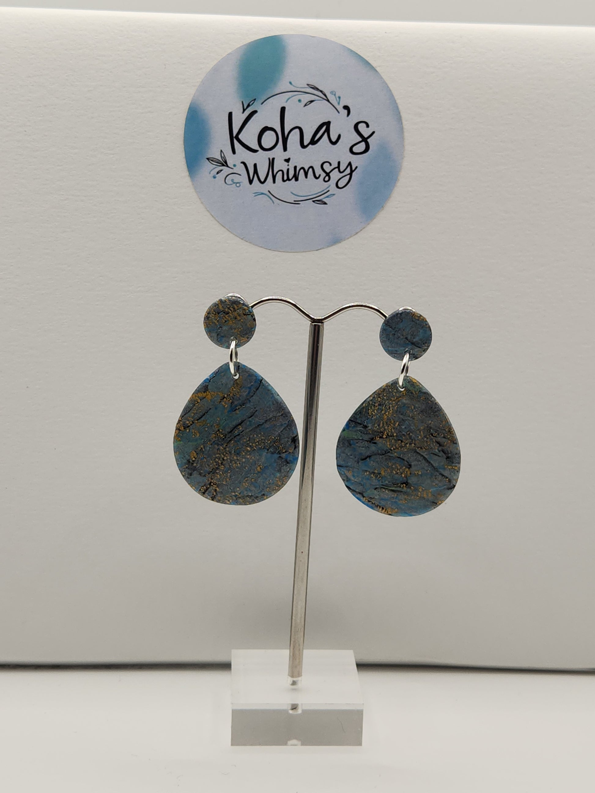 Crafted by hand from polymer clay, the River Reflections Jewellery Set features large teardrop stud earrings and a pendant necklace with three interlinked circles. The blue-grey blend, accented by black swirls and delicate gold foil, evokes the mesmerizing reflections seen on swirling rivers. This set combines artistic design with wearable elegance, perfect for those who appreciate unique, nature-inspired accessories.