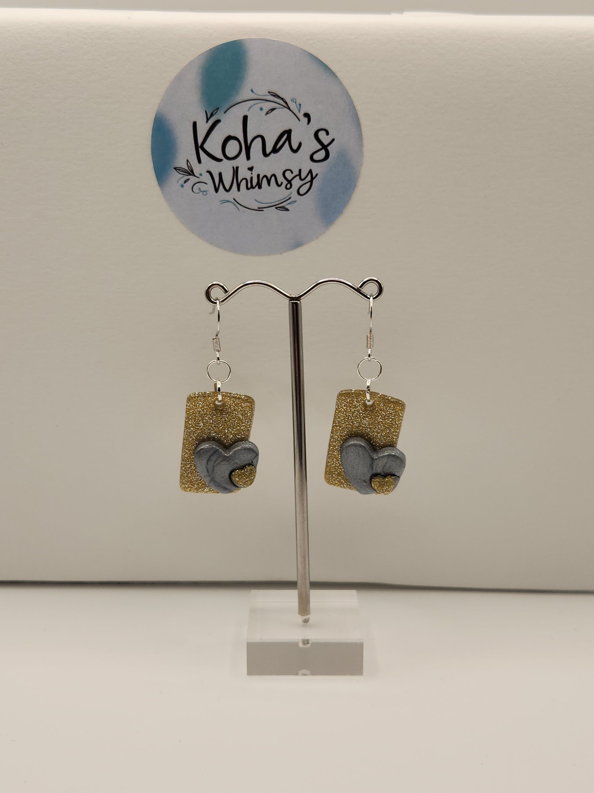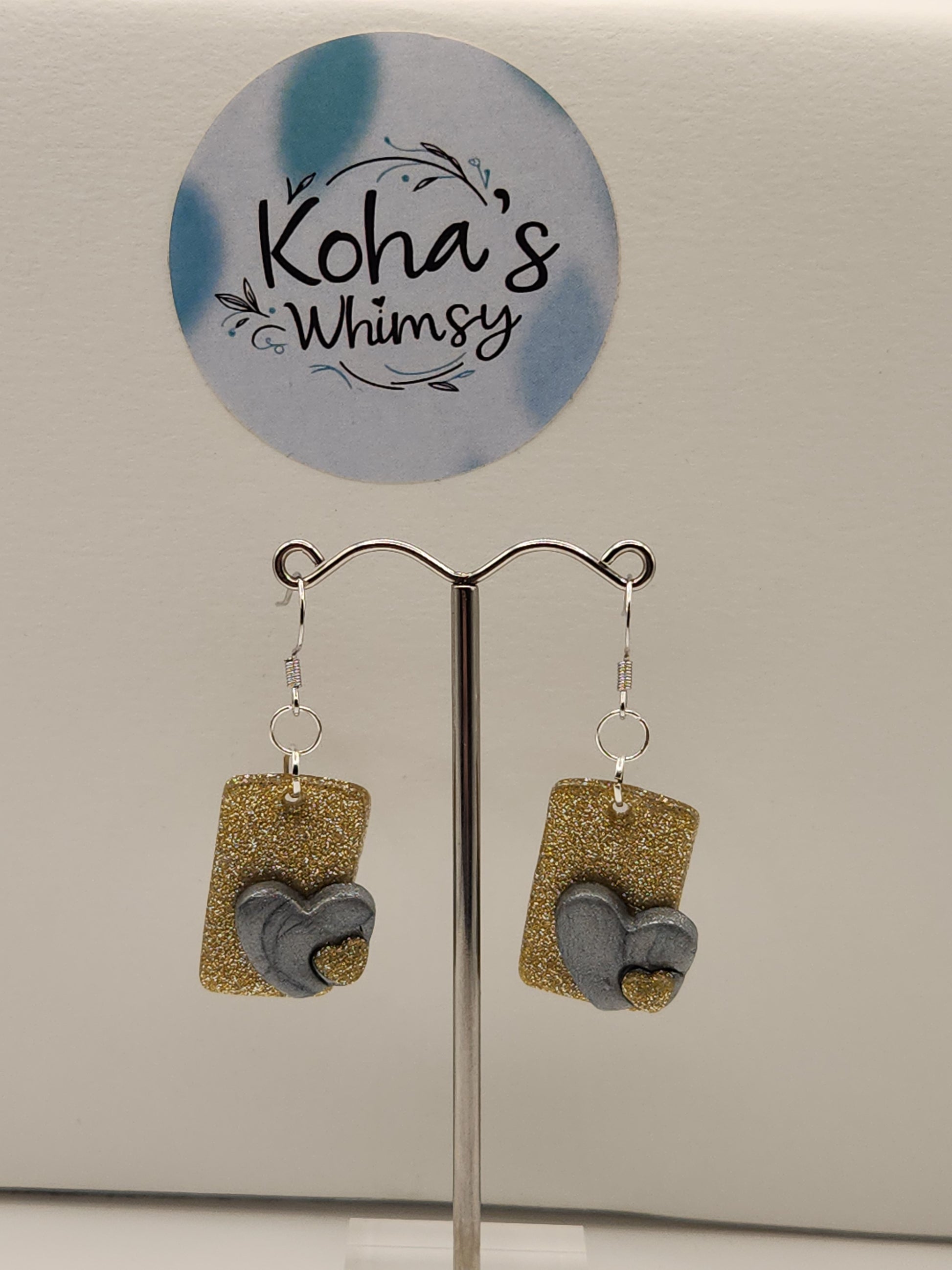 These handmade polymer clay earrings feature a shimmering glitter gold backdrop that beautifully contrasts with delicate silver heart accents. Expertly crafted, they offer a unique blend of elegance and charm, perfect for adding a refined touch to any outfit. Lightweight and comfortable, these dangle earrings are designed to complement both casual and formal styles with subtle sophistication.