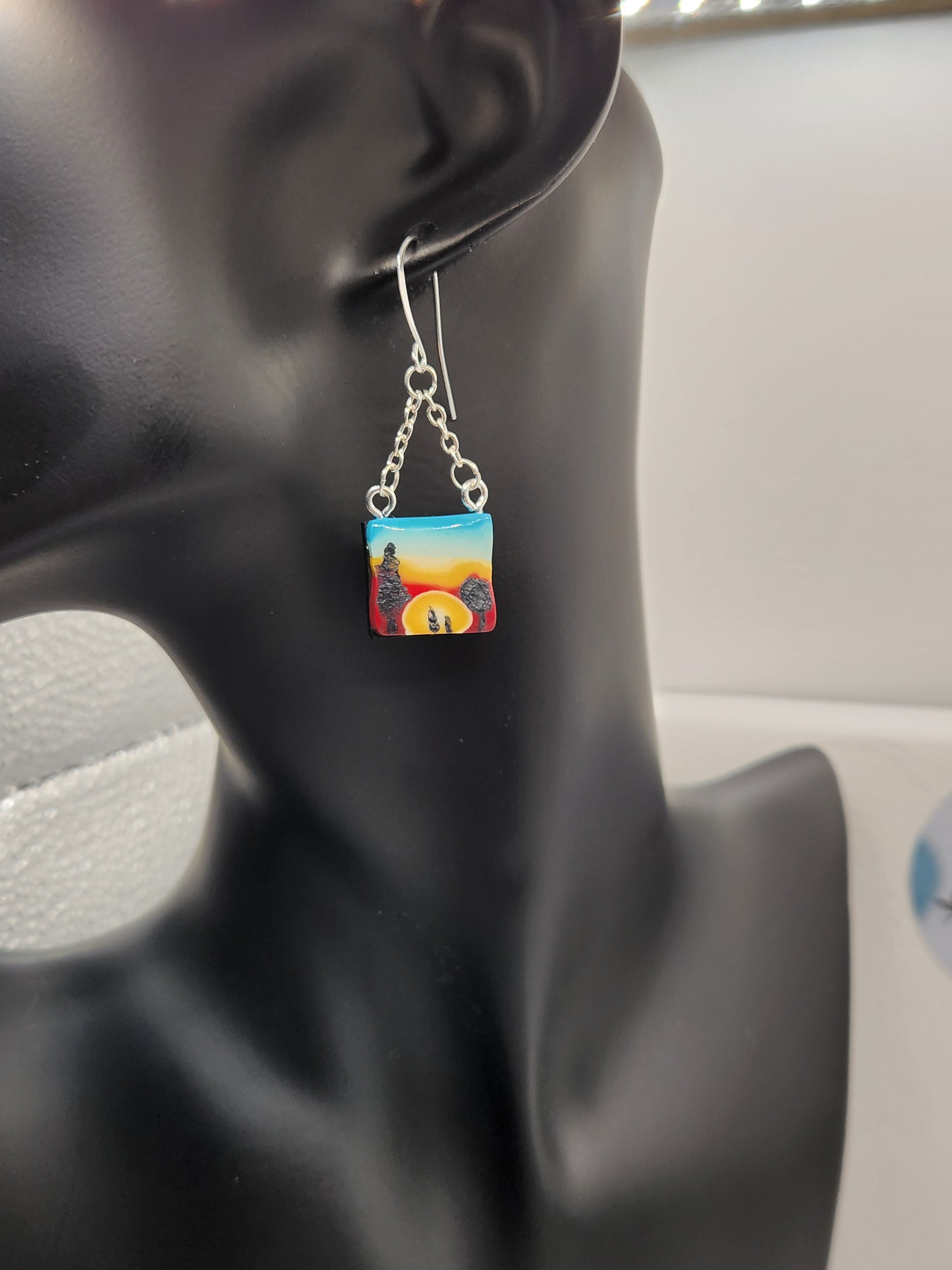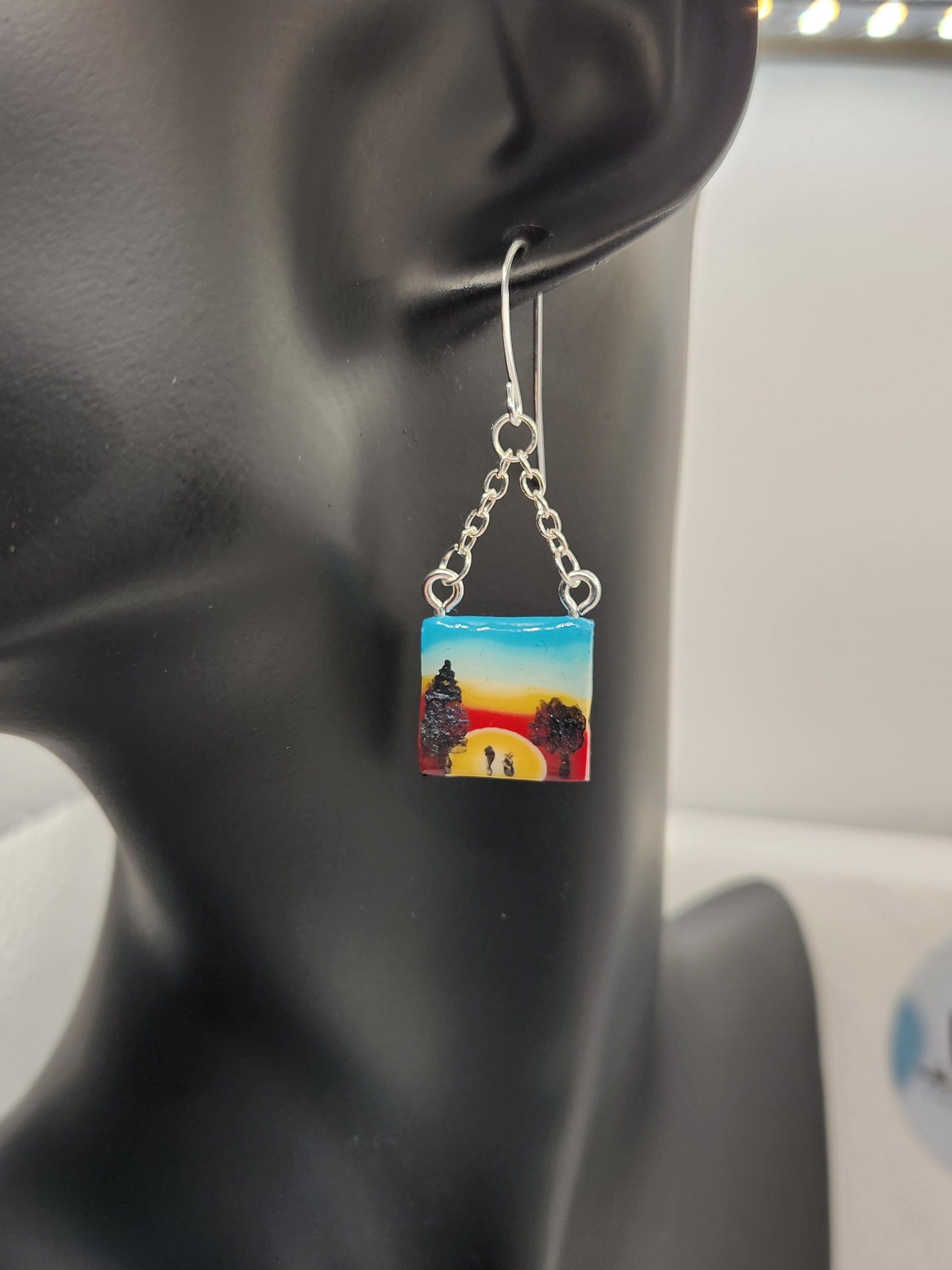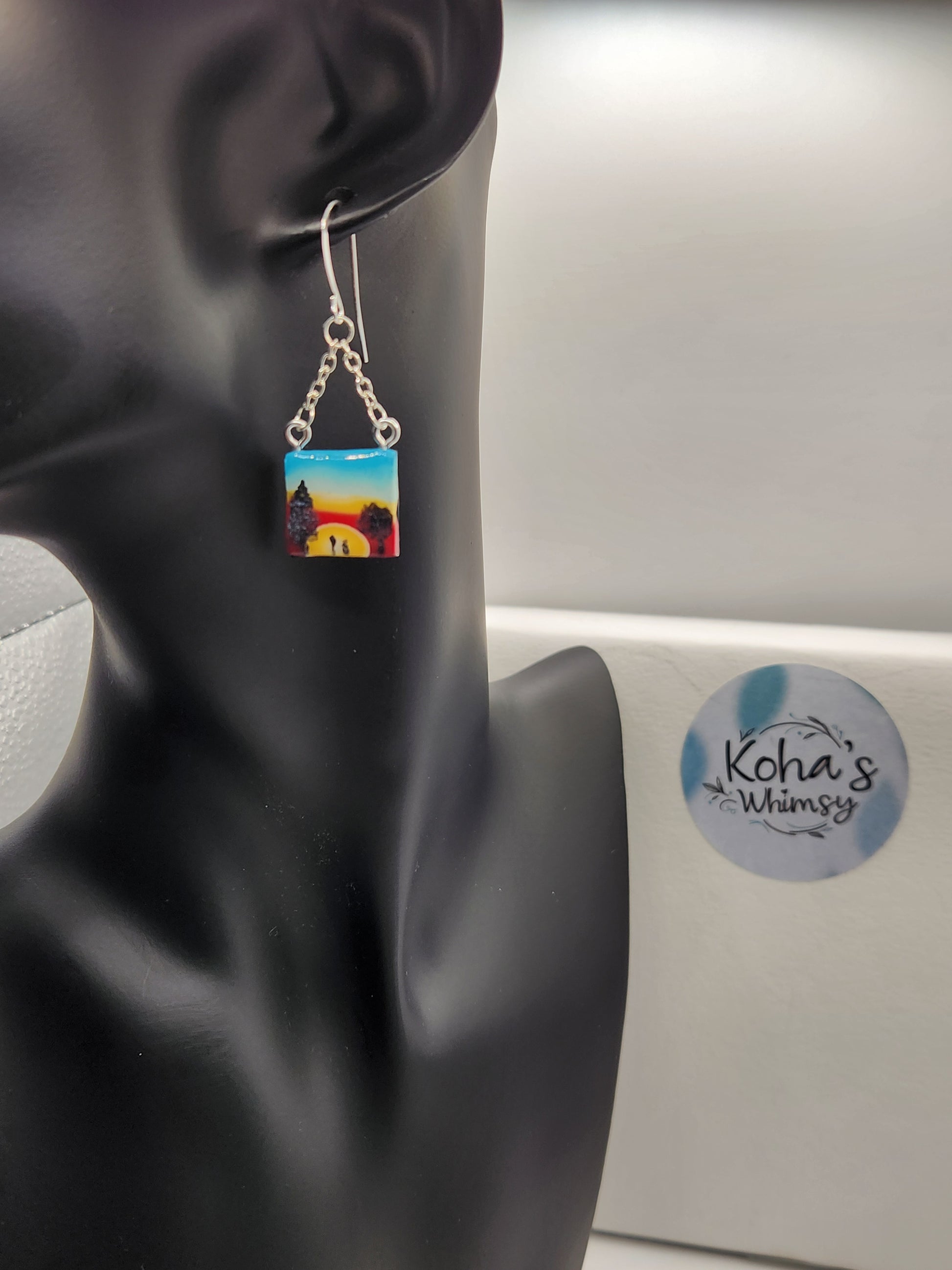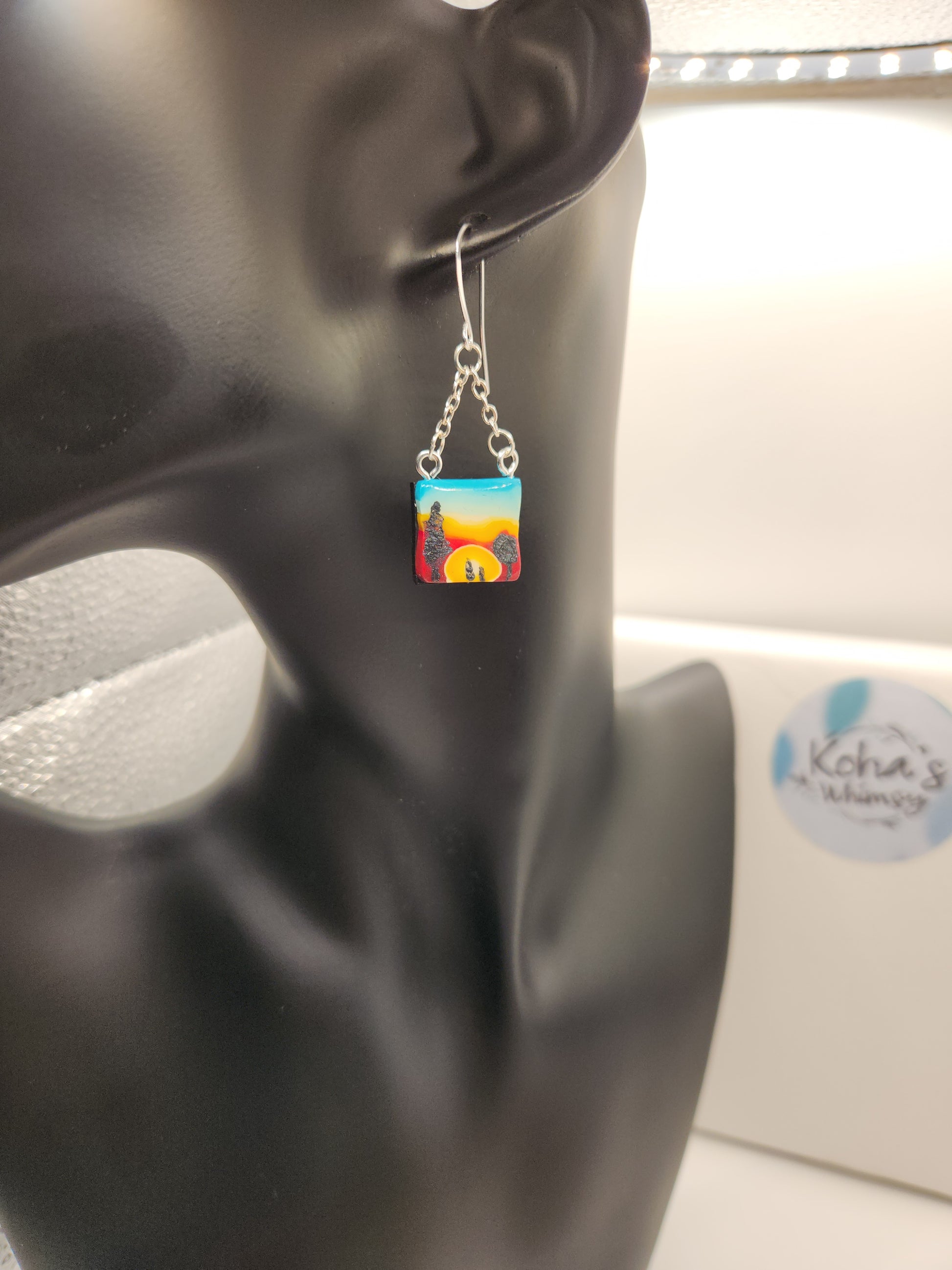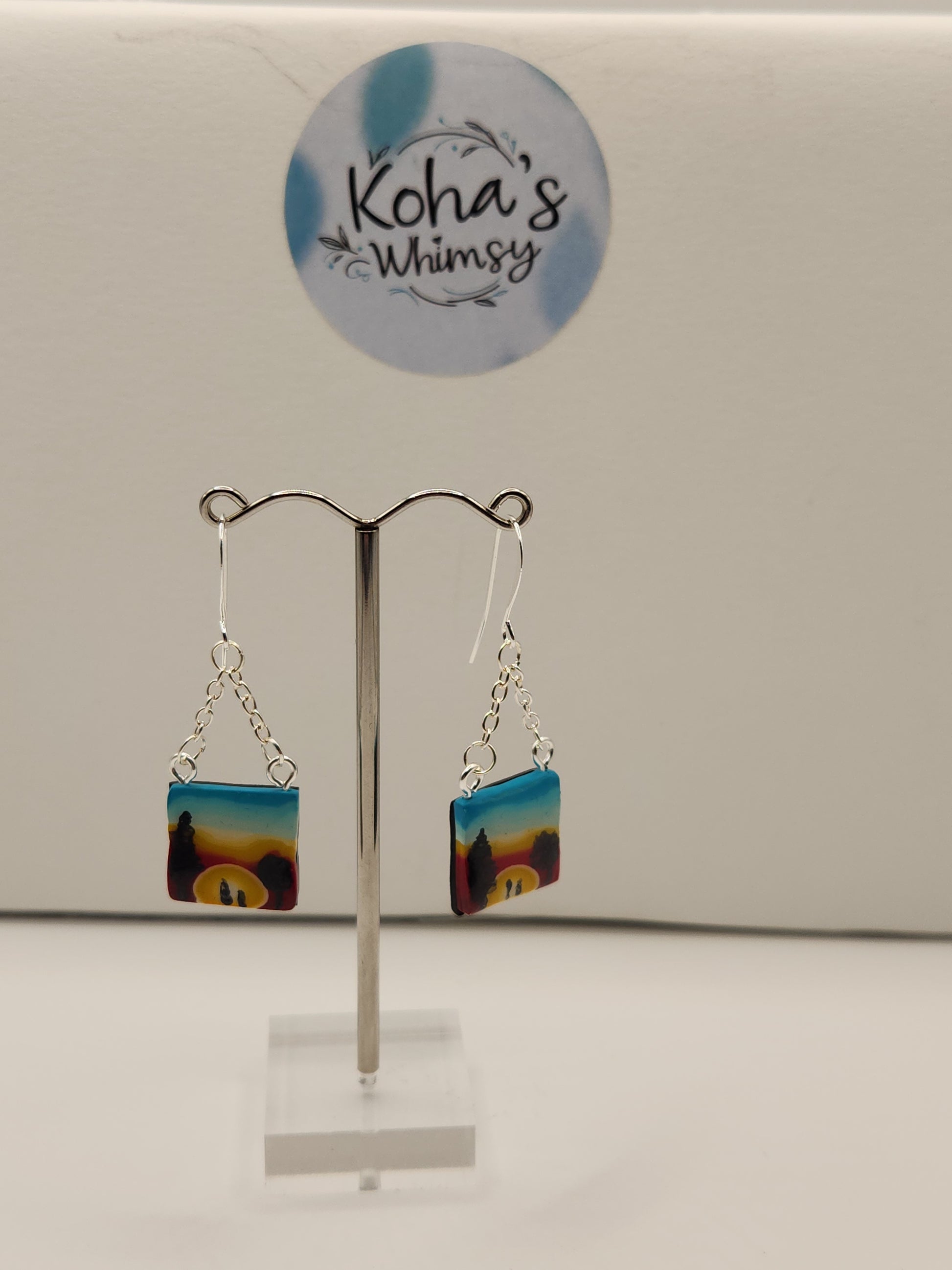 Capture the magic of dawn with these exquisite handmade polymer clay dangle earrings. Each piece features a luminous sunrise gradient backdrop, artfully layered with delicate painted silhouettes of towering trees and an intimate couple gazing toward the horizon. Meticulously crafted and hand-painted, these earrings blend natural beauty with romantic storytelling. Perfect for those who appreciate wearable art that celebrates life's serene moments and meaningful connections.