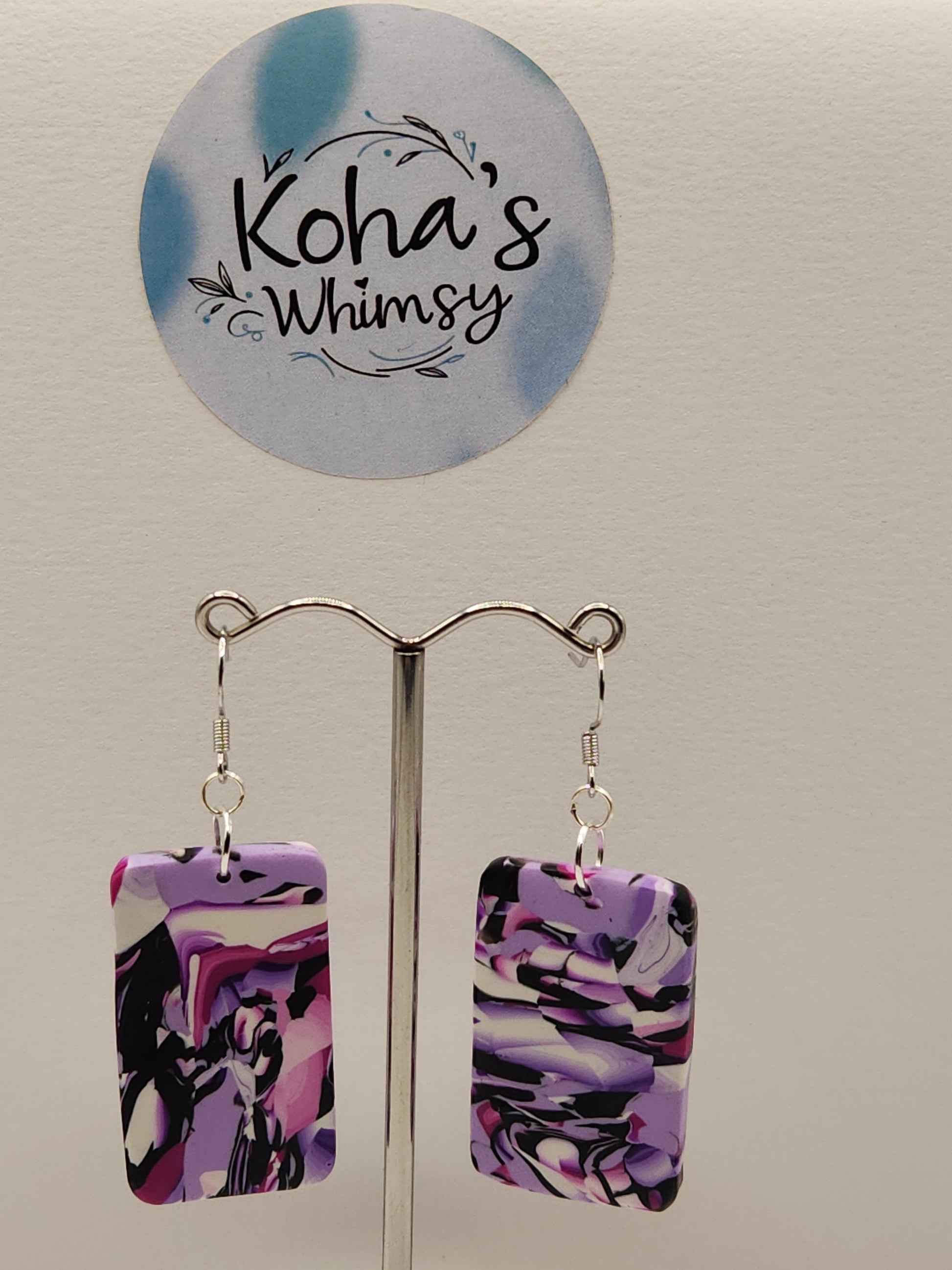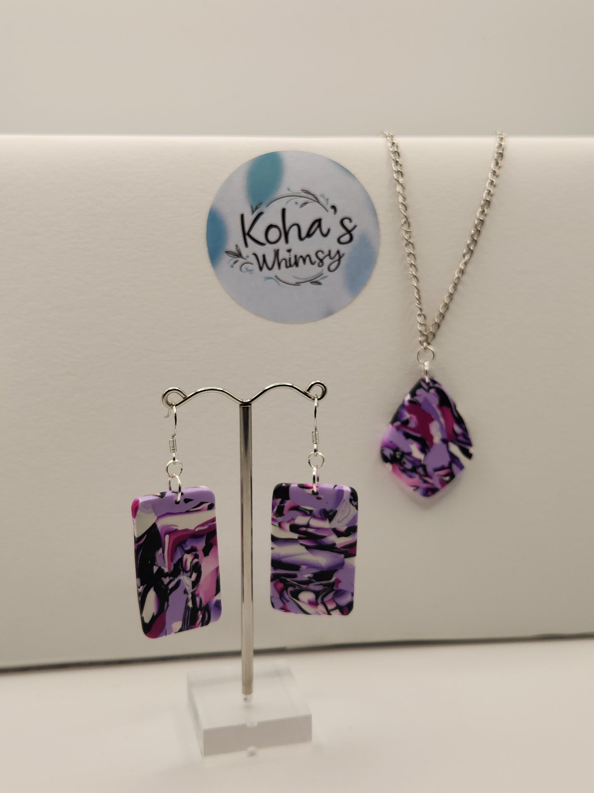 Discover the Violet Chaos Jewellery Set, featuring handmade polymer clay earrings with a dynamic mix of black, purple, and pink tones. These large rectangular dangle earrings offer a bold statement, perfectly complemented by a large drop diamond-shaped pendant necklace. Crafted for those who appreciate unique artistry and expert design, this set adds a sophisticated yet vibrant touch to any ensemble.