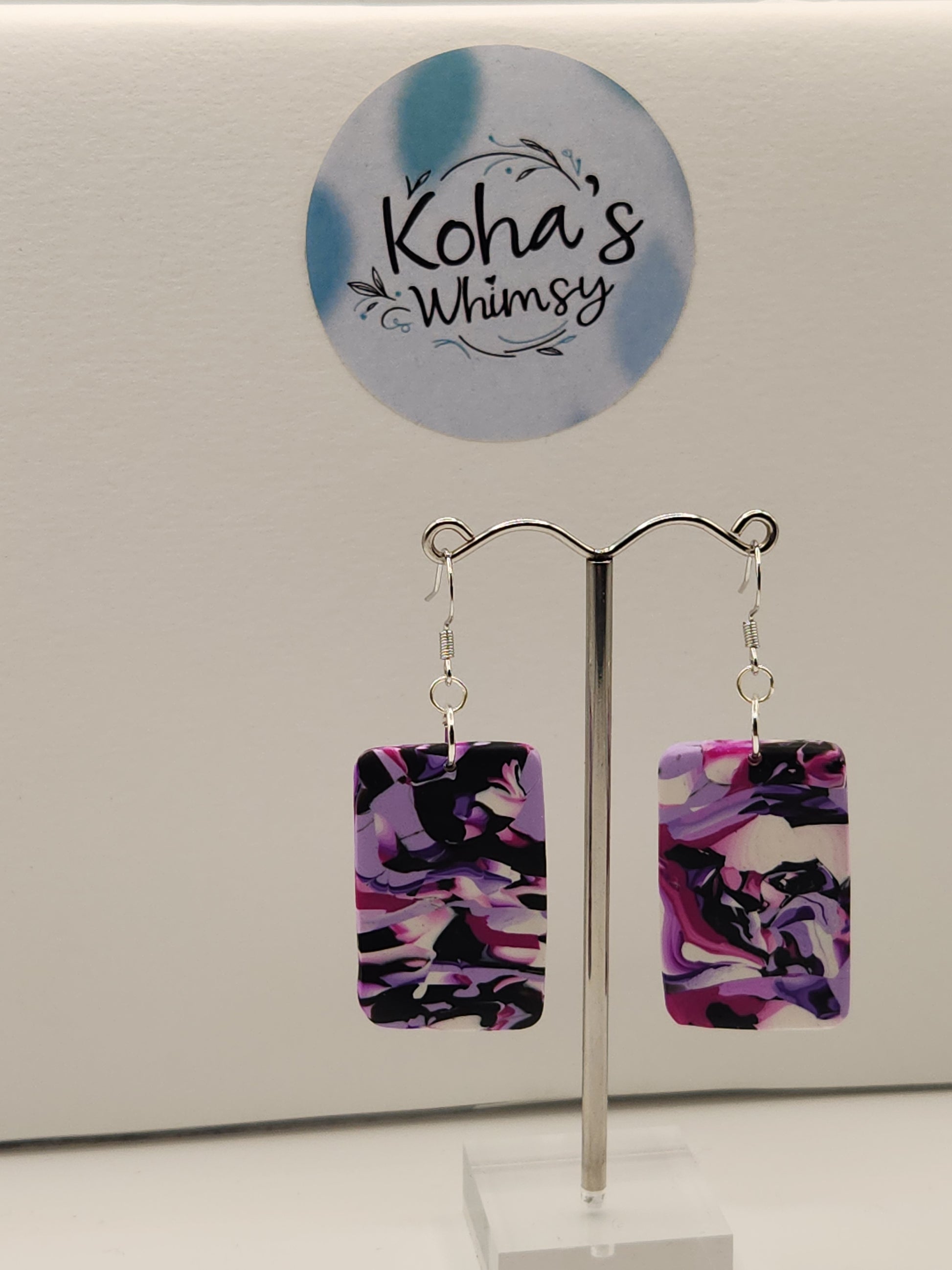 These handmade polymer clay earrings showcase a striking large rectangle design, featuring a dynamic blend of black with vibrant shades of purple and pink. Each pair is uniquely crafted, offering a bold statement piece that combines artistic flair with wearable elegance. Perfect for those seeking distinctive accessories that highlight expert craftsmanship and a vivid colour palette.