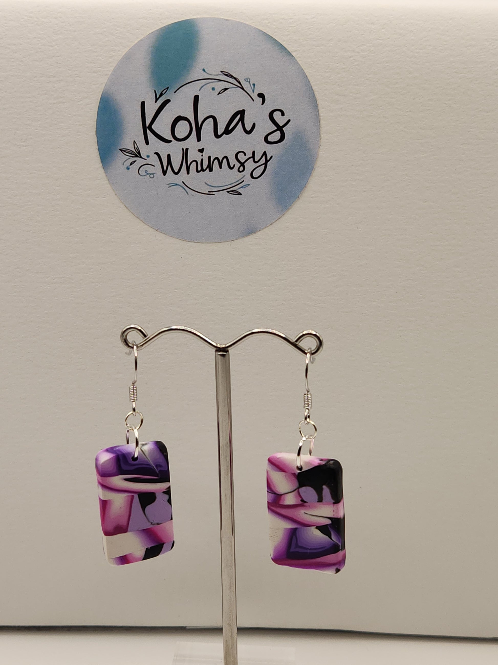 Discover the Violet Kaleidoscope Jewellery Set, featuring expertly handcrafted polymer clay earrings and a matching large rectangle pendant necklace. Each piece showcases a vibrant blend of purples and pinks, accented with striking white and black streaks. The small rectangular dangle earrings and bold pendant necklace offer a sophisticated yet artistic statement, perfect for elevating any ensemble with unique, wearable art.